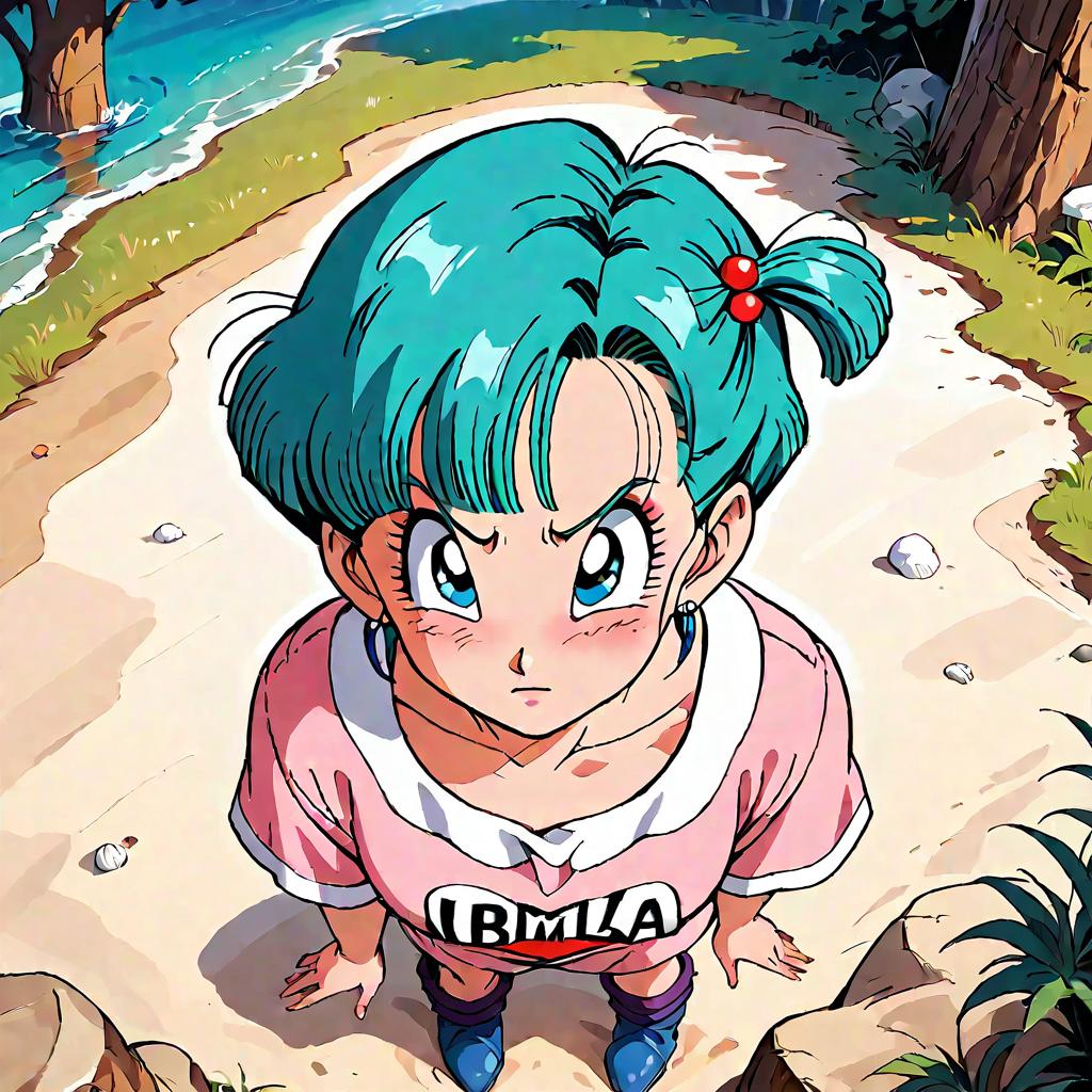 Source_anime, score_9, score_8_up, score_7_up, anime screencap, bulma \(dragonball\), 1girl, standing, solo, drawing, embarrassed, pajamas, collarbone, blue eyes, boots, blue footwear, dress, aqua hair, full body, outdoors, sky, day, socks, tree, one side up, pink dress, oversized clothes, purple_legwear, eyebrows, eyelashes, logo print, ((from above)), looking at viewer, blush, retro artstyle, 1990s \(style\), beach