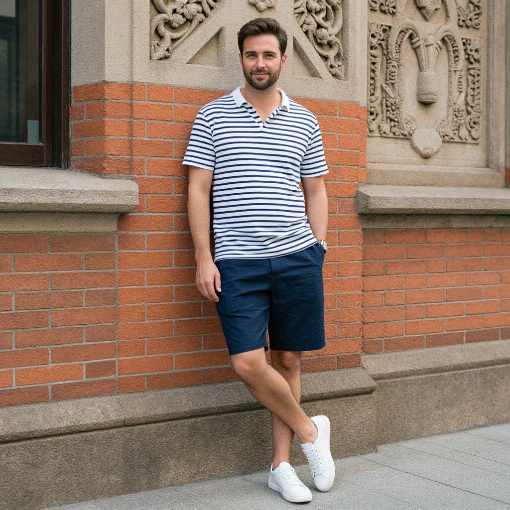A man, short-sleeve Breton stripe shirt, relaxed-fit navy shorts, white leather sneakers, effortless summer chic, historic brick architecture, ornate details, medium format film, relaxed smile, casual confidence. Man has masculine face and piercing eyes