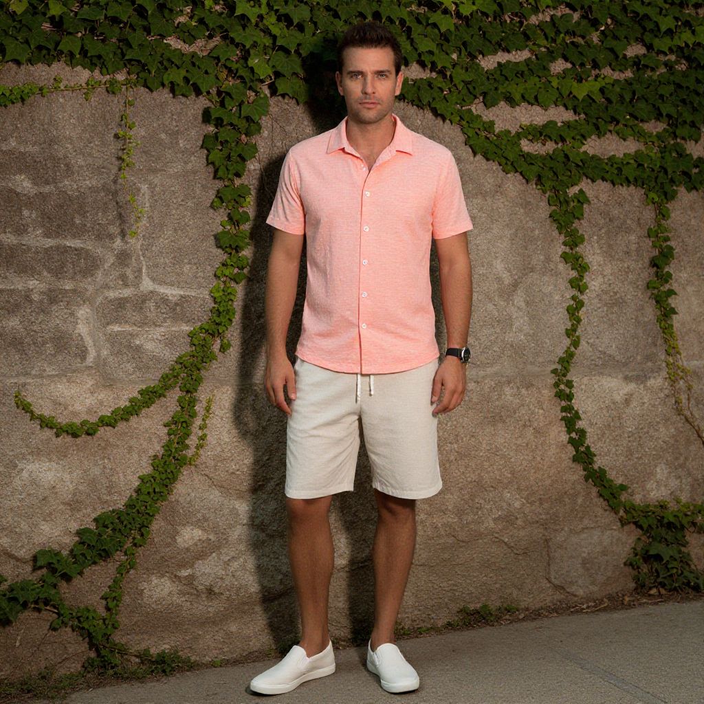 Photograph of a young man leaning against a red brick building with intricate stone carvings. He has a short, dark beard and short, dark hair. He wears a white and black striped polo shirt, navy blue knee-length shorts, and white sneakers. His right hand is in his pocket, and he stands with his left leg slightly crossed in front of the right. The building's texture contrasts with his casual, modern attire. The background includes a large window to the left and detailed stone relief on the right. The sidewalk is light gray.