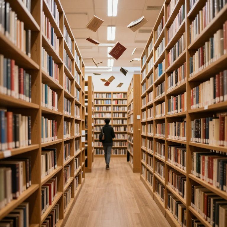 Photograph of a library aisle with wooden bookshelves on both sides, filled with books of various colors and sizes. The shelves extend into the background, converging towards a single, blurred figure walking away, dressed in dark clothing. Several books are floating in mid-air above the aisle, adding a whimsical touch. The floor is made of light-colored wood, and the ceiling has fluorescent lights. The overall atmosphere is warm and inviting, with a focus on the organized yet slightly magical setting.
