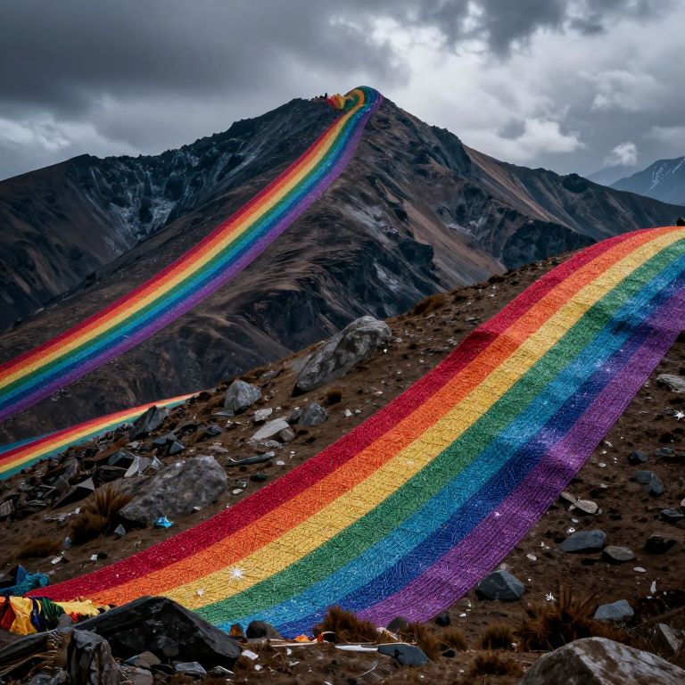 Mountains wear woven tapestries stitched from rainbows and starlight, dancing rhythmically to the pulse of an unseen cosmic beat.