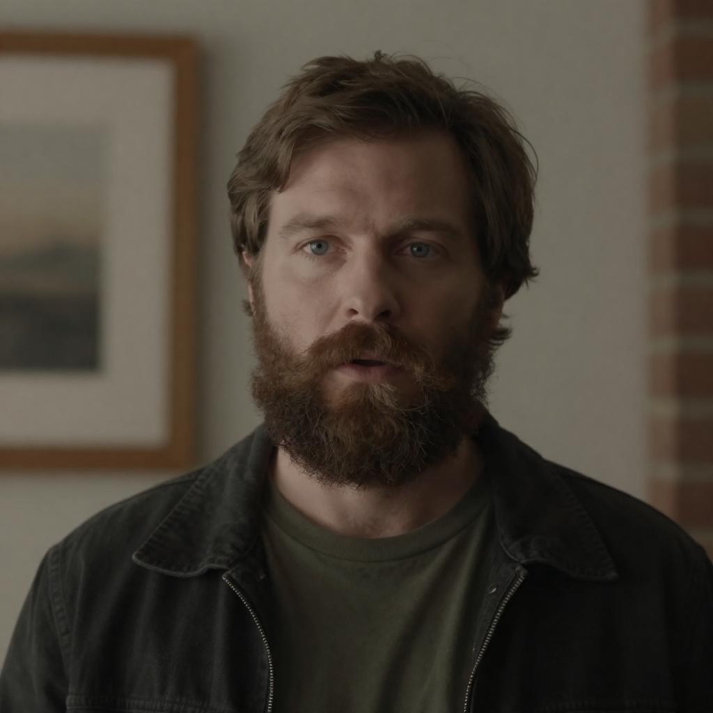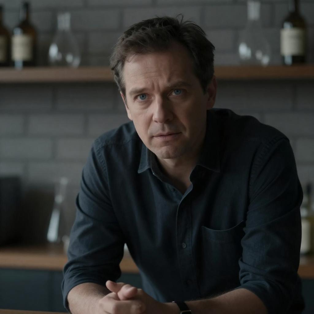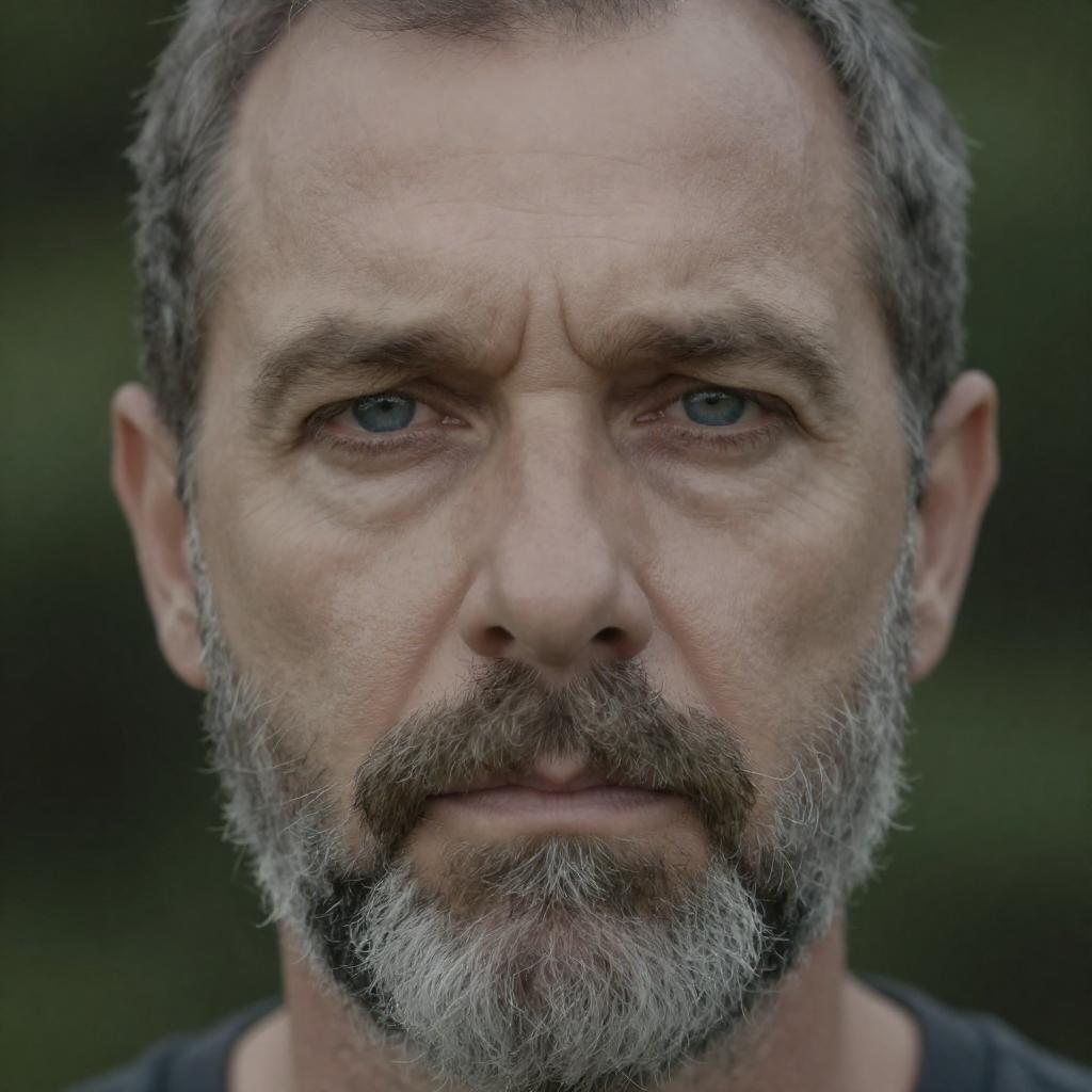 Photograph of a middle-aged man with a rugged beard and disheveled hair, wearing a gray shirt, standing in an industrial workshop. Background includes red and black machinery. Man's intense gaze directed at the camera. Soft, uneven lighting.