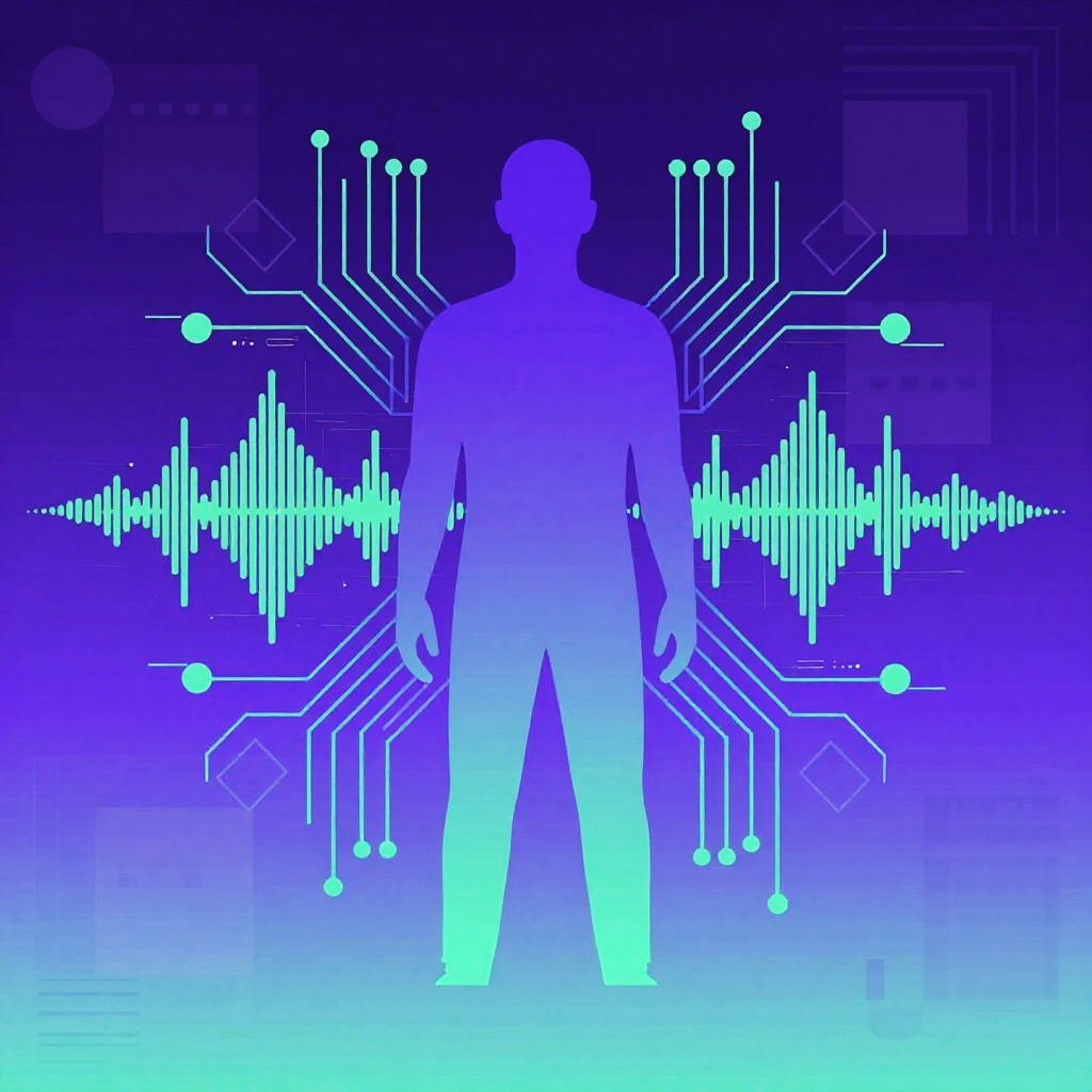 AI concert poster generator aesthetic, combining geometric patterns and digital glitch effects, luminous gradients in purple and teal, stylized AI figure surrounded by circuits and sound waves, minimalist yet eye-catching design, techno music atmosphere.