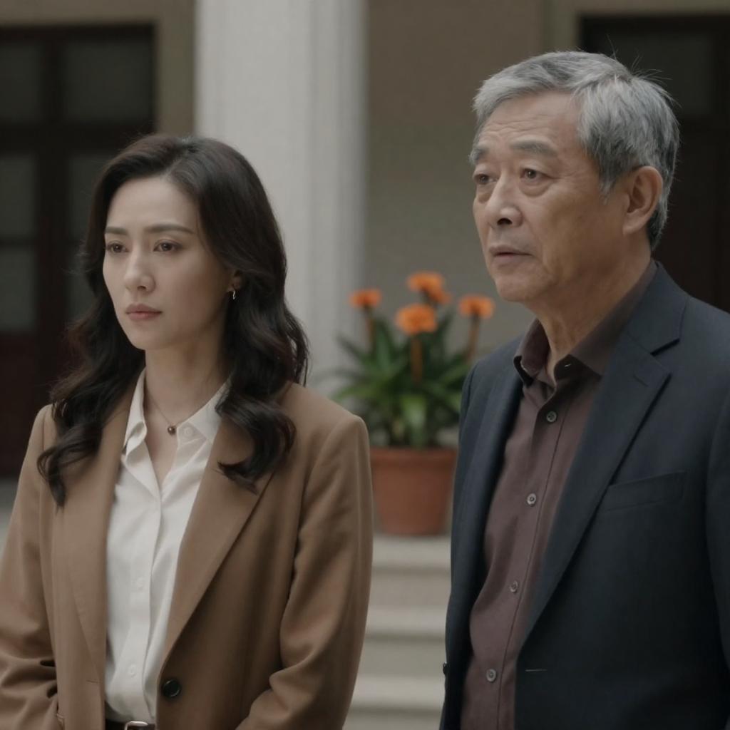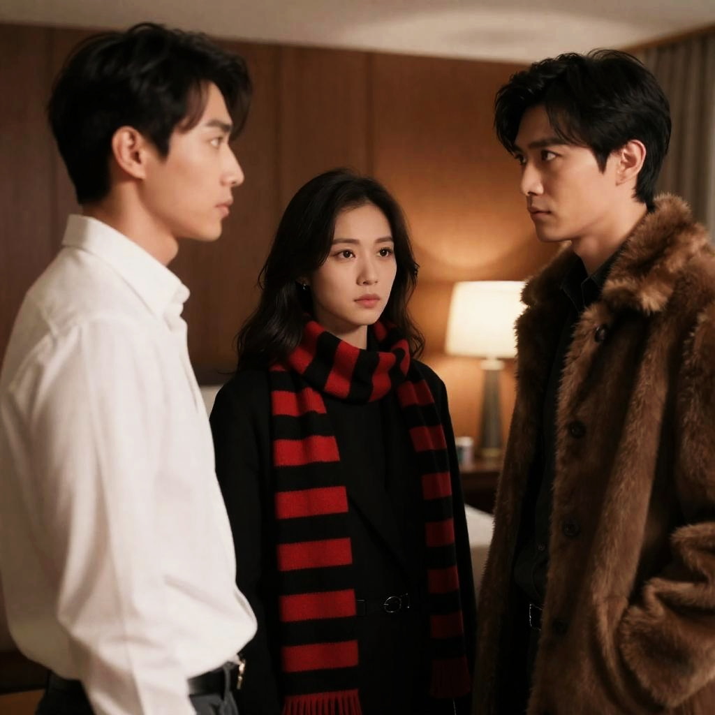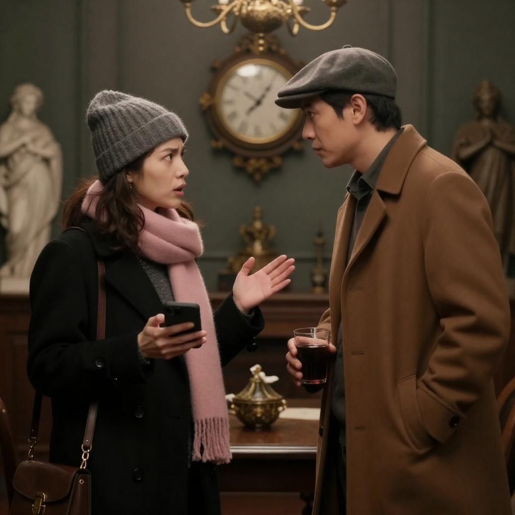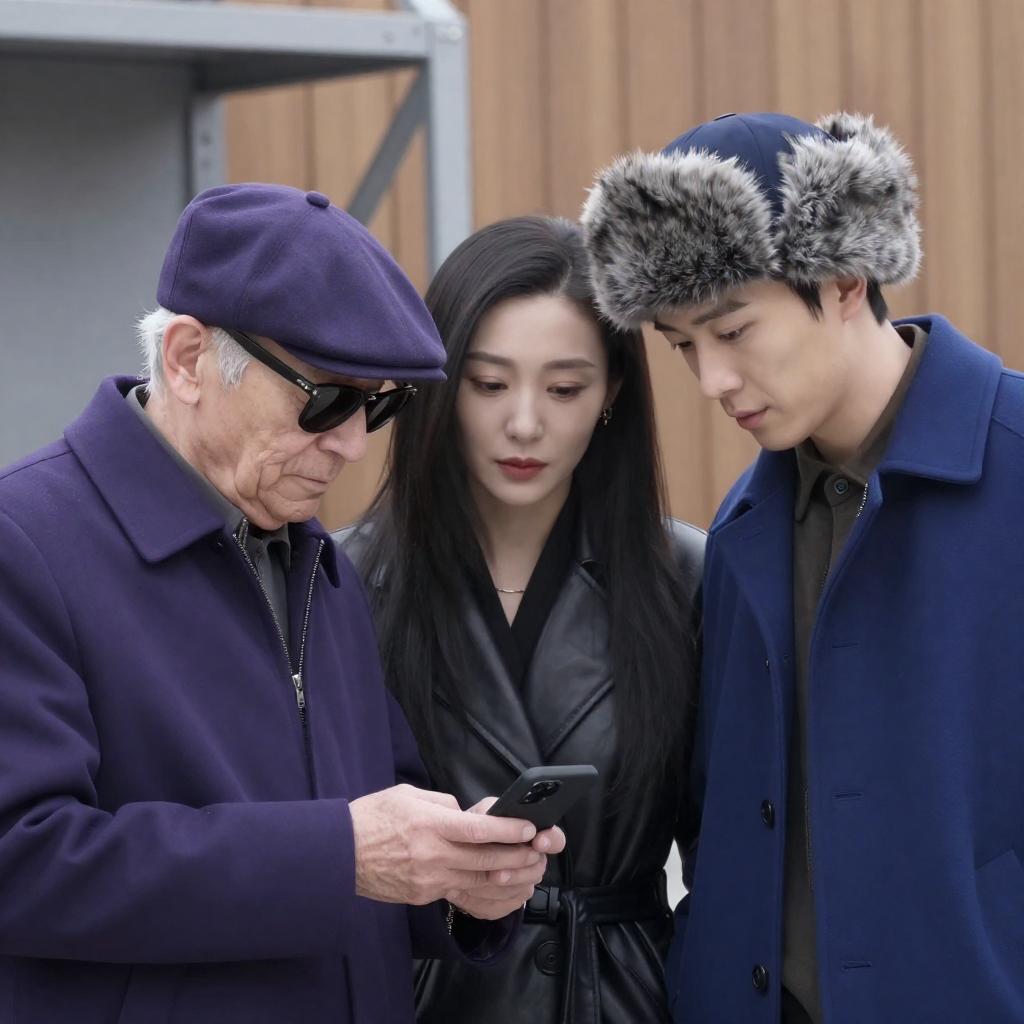 Photograph of three people outdoors. Elder man with purple flat cap, dark sunglasses, and purple coat examines phone. Middle woman with black leather coat and long black hair looks down. Young man with grey fur hat and blue coat leans close. Background has metal structure and wooden wall. All have neutral expressions.
