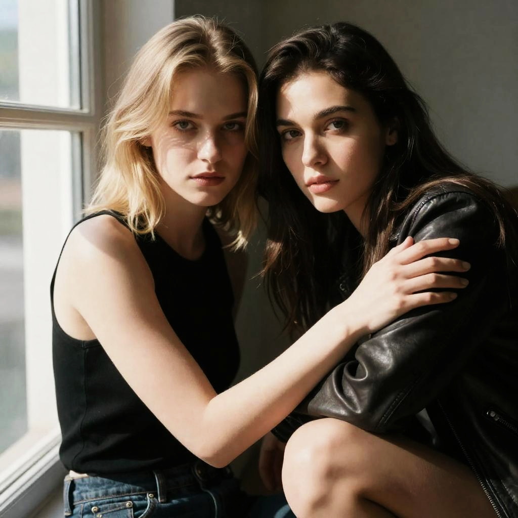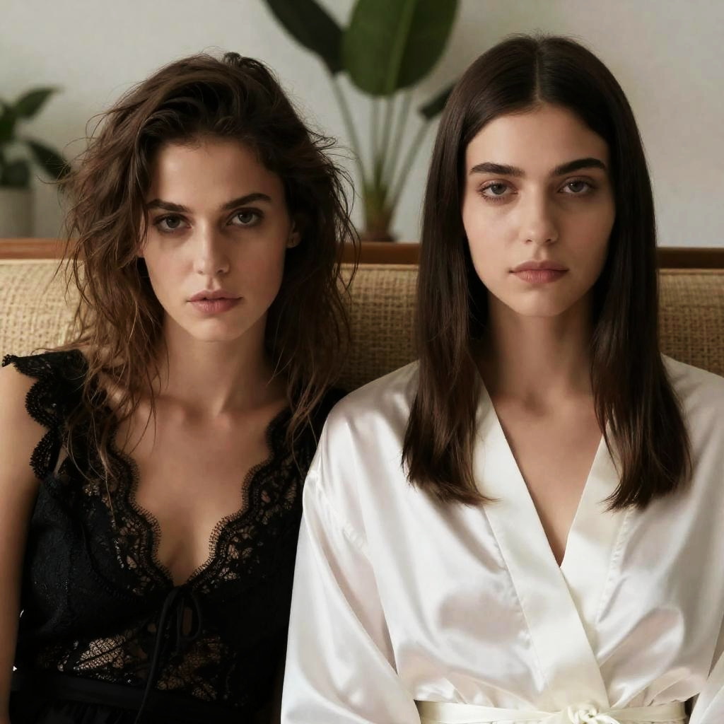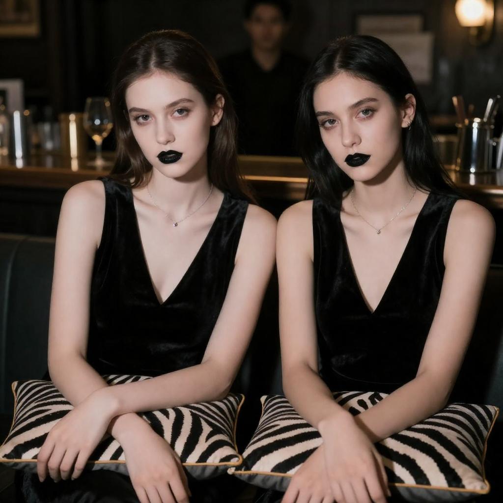 Two women with pale skin and black lipstick sit in a dimly lit bar. They wear sleeveless black velvet dresses with deep V-necks and silver necklaces. Their dark hair is pulled back, and they both have intense, focused expressions. One woman's arms rest on a zebra-patterned pillow. A blurred person stands in the background.
