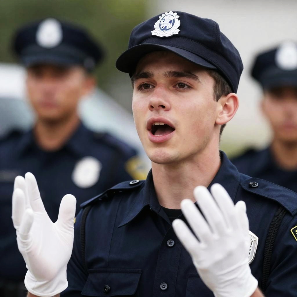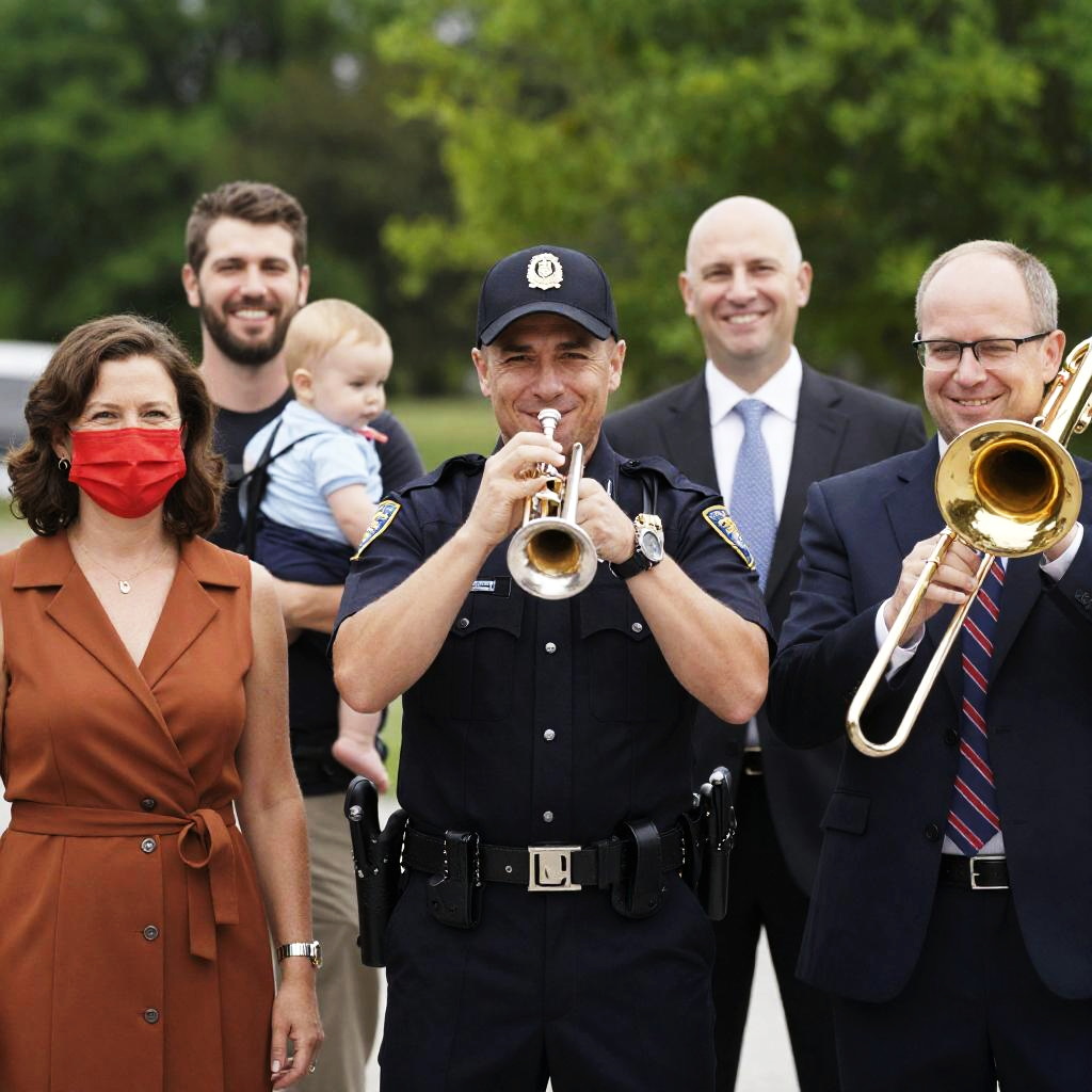 Photograph of six people outdoors. Woman with red mask and brown dress on left, smiling. Police officer playing trumpet in center, smiling. Man with baby on back, smiling. Bald man in suit with tie, smiling. Man with glasses and striped tie on right, smiling. Trombone player on right. Green trees in background. Bright daylight.