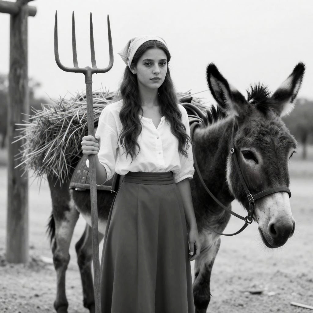 Black-and-white photograph of a young woman with long hair, wearing a white blouse, high-waisted skirt, and headscarf, holding a pitchfork. She stands beside a donkey with a load of hay on its back. Wooden posts are in the background. The woman's expression is neutral. The donkey's head is turned slightly to the right. The setting is an outdoor, rural area with a sandy ground.