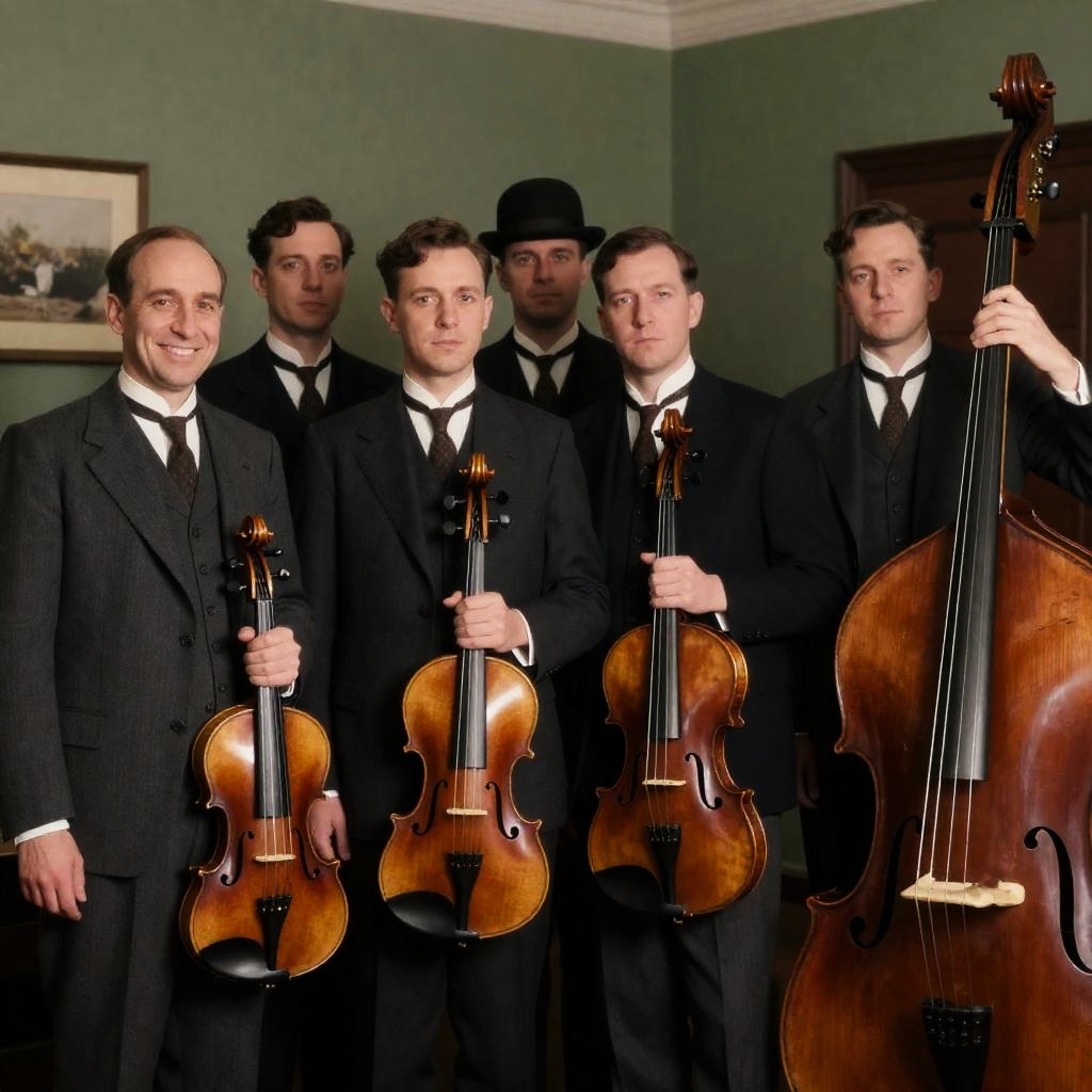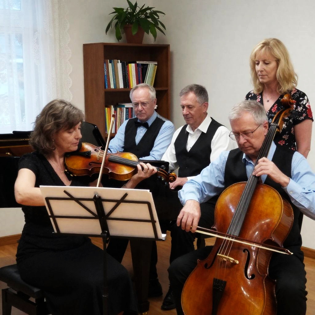 Photograph of a piano quartet. Three older adults, one woman and two men, play piano, violin, and cello. Woman in black dress sits left, two men in vests and shirts sit right, blonde woman in floral dress stands right. Piano in center, music stand in front of woman, lace curtain on left, bookshelf with plants and books in background. Soft natural light, casual, focused performance.