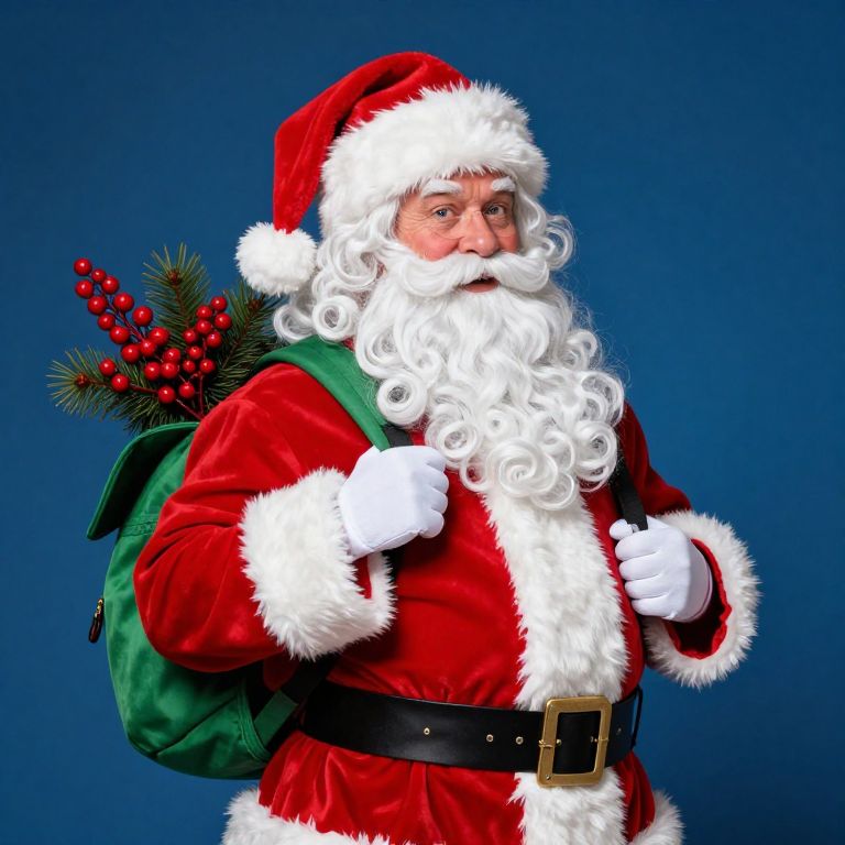 Photograph of Santa Claus with a full white beard, red velvet suit, white fur trim, green backpack with pine and berries, against a blue background