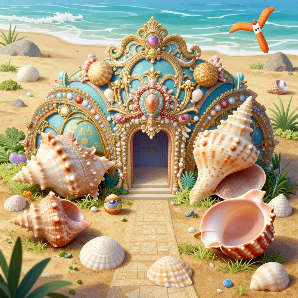 This digital artwork depicts an ornate, jewel-encrusted seashell entrance nestled on a sandy beach with turquoise waves in the background. The entrance features intricate gold and turquoise detailing with large, decorative seashells and pearls adorning its archways. Two massive, spiraled conch shells flank the door, while smaller shells and pebbles are scattered across the sand. A bright orange bird with a white face flies above. Green beach plants sprout around the entrance, and a stone pathway leads to the door. The vivid colors and detailed textures create a whimsical, fantasy-like scene.