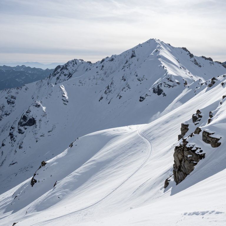 Snow-capped peaks rise majestically against a hazy sky, their rugged surfaces etched with deep crevices and ridges, while a winding trail carves through the pristine expanse of snow, flanked by rocky outcrops and distant mountain silhouettes.