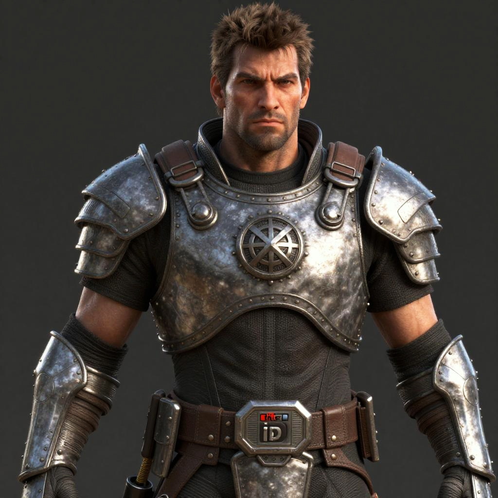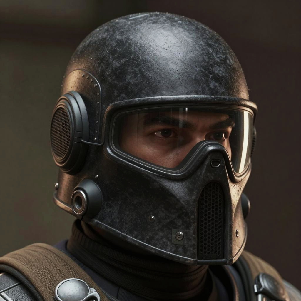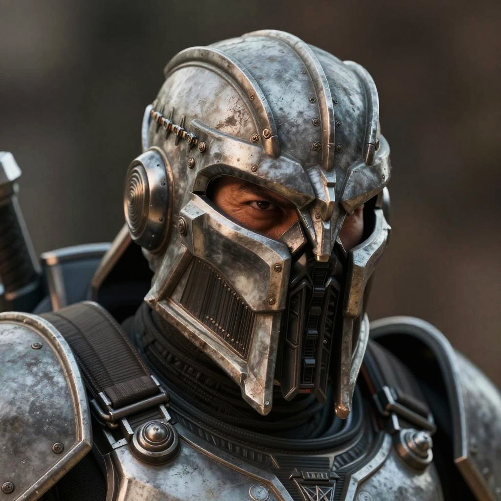 Visor from Quake id Software game photographed on a Nikon, rendered in a photorealistic style. The image captures the character with lifelike detail, highlighting intricate textures and features of the futuristic armor. The realistic lighting and high-resolution quality give the scene an authentic, cinematic feel, making the character appear as if they exist in the real world.