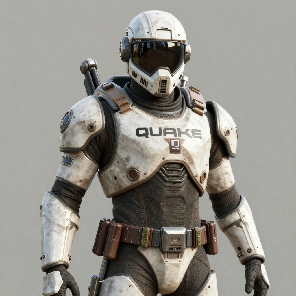 CGI image of a futuristic white armored soldier with "QUAKE" label, black chest and arm pads, helmet with visor, and brown utility