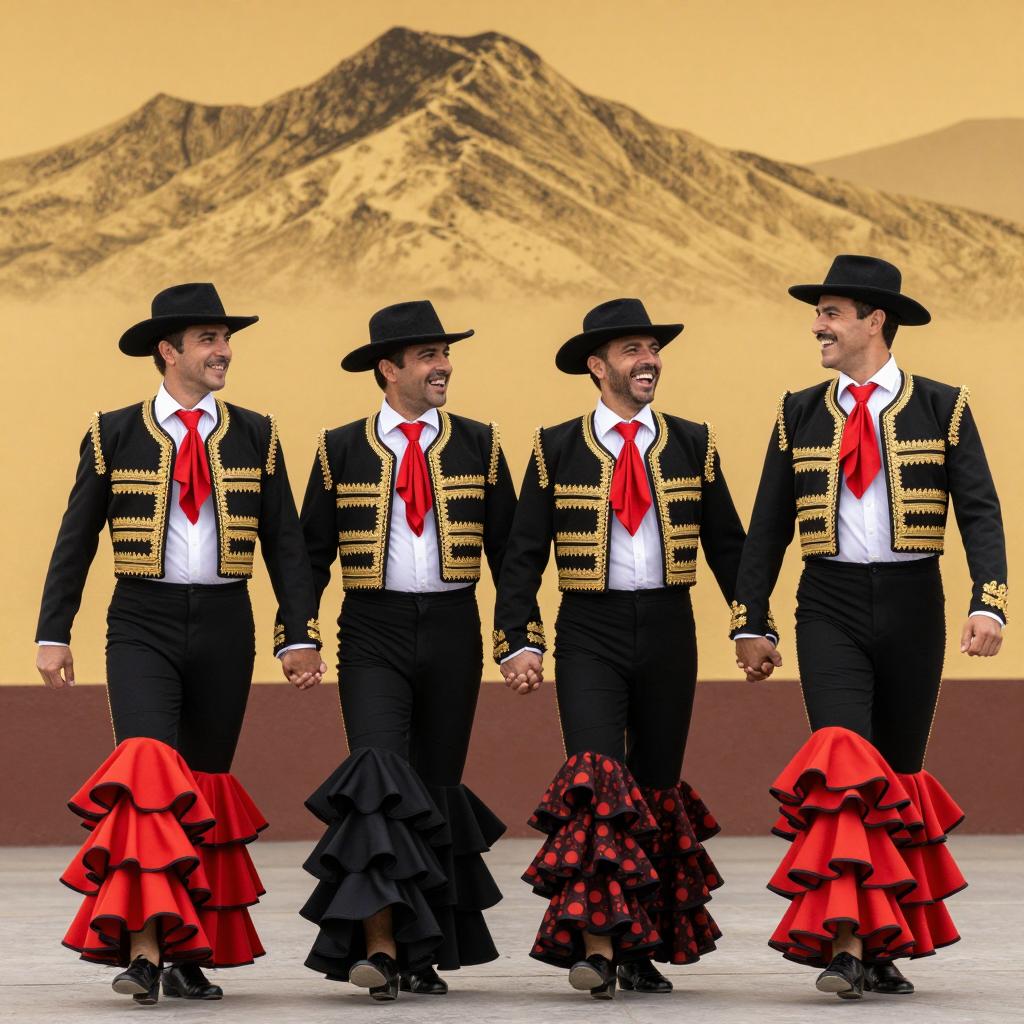 Four men in black Spanish flamenco outfits with gold embroidery, red sashes, black hats, and white shirts, walking in a line. They hold hands, smiling with open mouths. Yellow mountain landscape painting in the background. One man on the right has a mustache, others do not.
