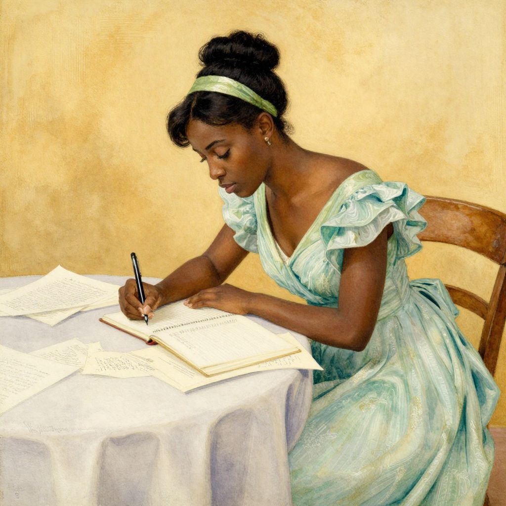 This is a digitally enhanced photograph of a Black woman with dark skin, seated at a white-clothed table, writing in an open notebook with a black pen. She has her hair styled in a neat bun, adorned with a light green headband. She wears a light green, off-shoulder dress with ruffled sleeves. The background is a warm, beige gradient. The woman is focused on her writing, with her head slightly bowed and eyes downcast. Her expression is calm and concentrated. The chair she sits on is wooden, partially visible behind her. The overall style of the image has a slightly painterly, textured quality.
