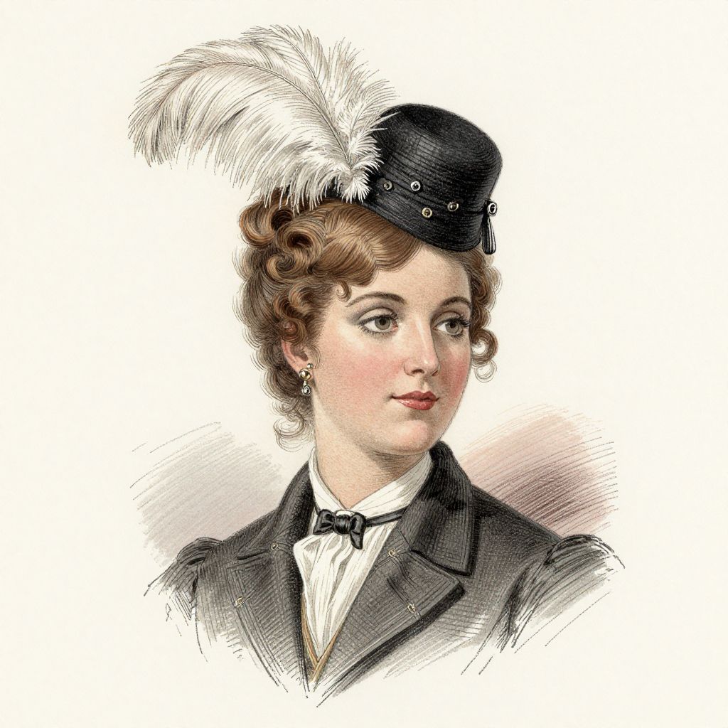 A vintage fashion illustration featuring a woman with 1900s-inspired hair styled in curls, adorned with a black hat embellished with white feathers and tassels, rendered in a classic sketch style with detailed linework and soft shading.