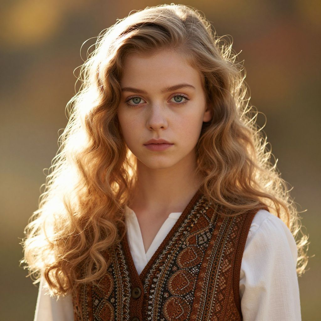 Photograph of a young woman with long, wavy blonde hair illuminated by sunlight, giving a golden glow to her hair. She has light blue eyes and a neutral expression. She's wearing a brown, intricately patterned vest over a white shirt. The background is softly blurred, showing autumnal colors. Her gaze is directly at the camera, creating a focused and intense look.