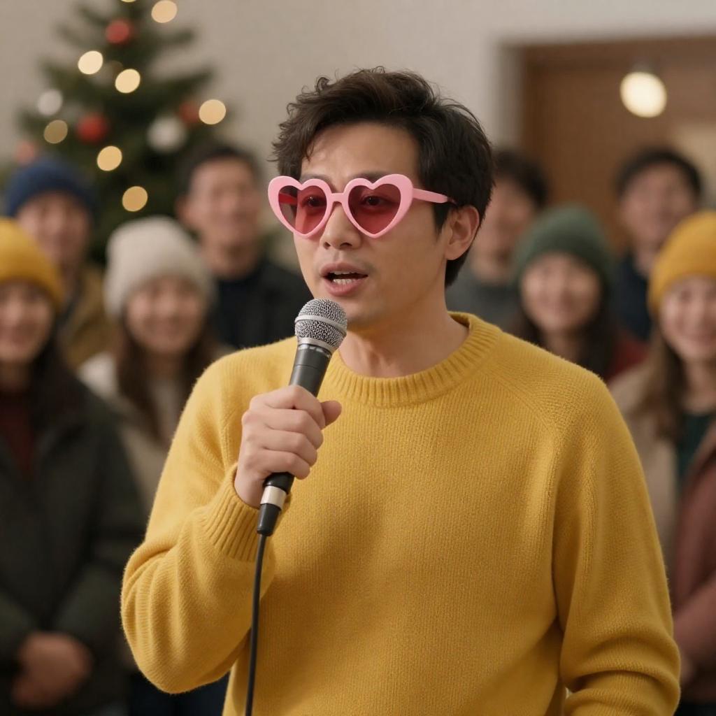 Photograph of a man with dark hair, yellow knit sweater, and pink heart-shaped sunglasses, holding a microphone, speaking to a crowd. Background: blurred people, festive Christmas lights, and warm indoor lighting. Man's mouth open, wearing a yellow hat. Crowd: diverse, wearing winter clothes, some smiling.