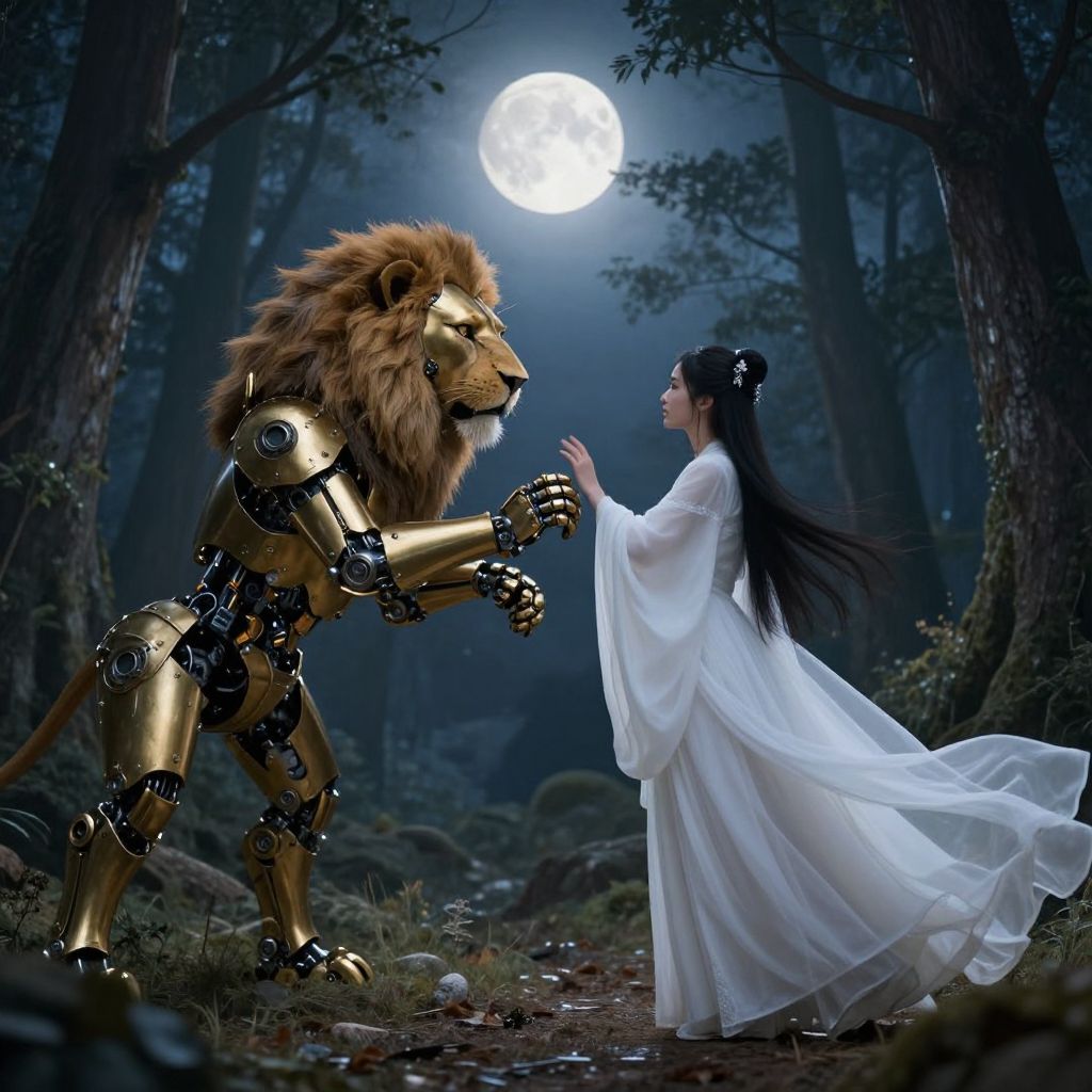 Digital art: Medieval forest moonlit scene, cybernetic golden lion with mechanical limbs, facing ethereal Asian woman in flowing white robe, reaching out