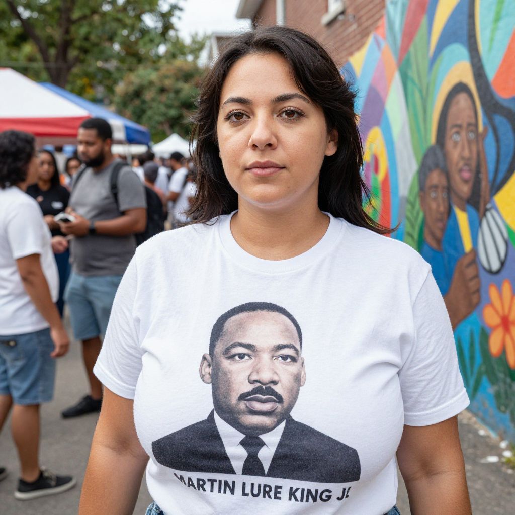 Photograph of a Latina woman with long black hair, wearing a white T-shirt with Martin Luther King Jr.'s portrait, standing in front of vibrant
