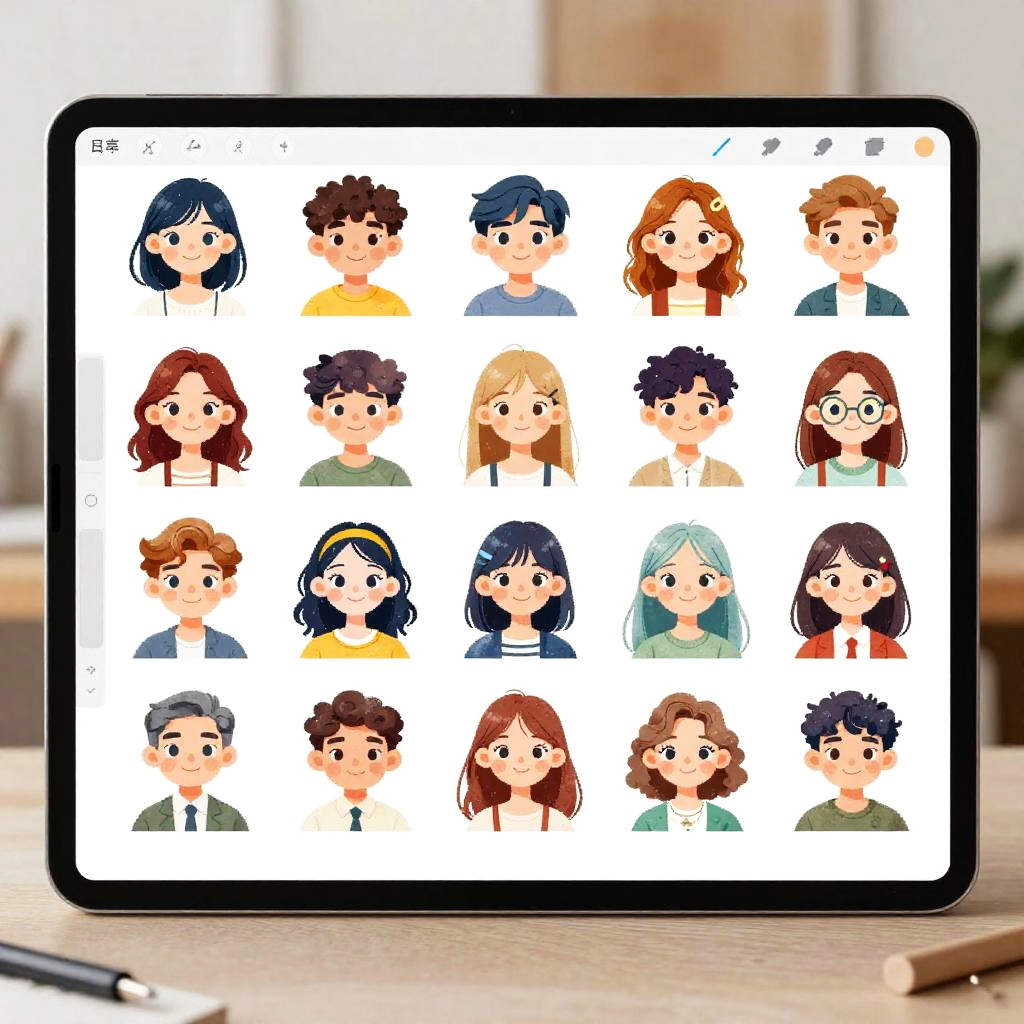 Photograph of a tablet displaying a grid of 20 cartoon-style avatar portraits, each with distinct features such as different hair colors, styles, and eye shapes. The avatars are arranged in a 4x5 grid on a white background. The tablet has a black border and is placed on a wooden surface with a blurred background. The avatars include various skin tones, and some wear glasses or headbands, showcasing a diverse range of characters. The style is colorful and simple, with large, expressive eyes and minimalistic details.