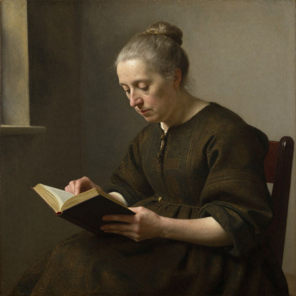 Photograph-style painting of a focused elderly woman with gray hair in a bun, wearing a black dress, reading a book in dim light.