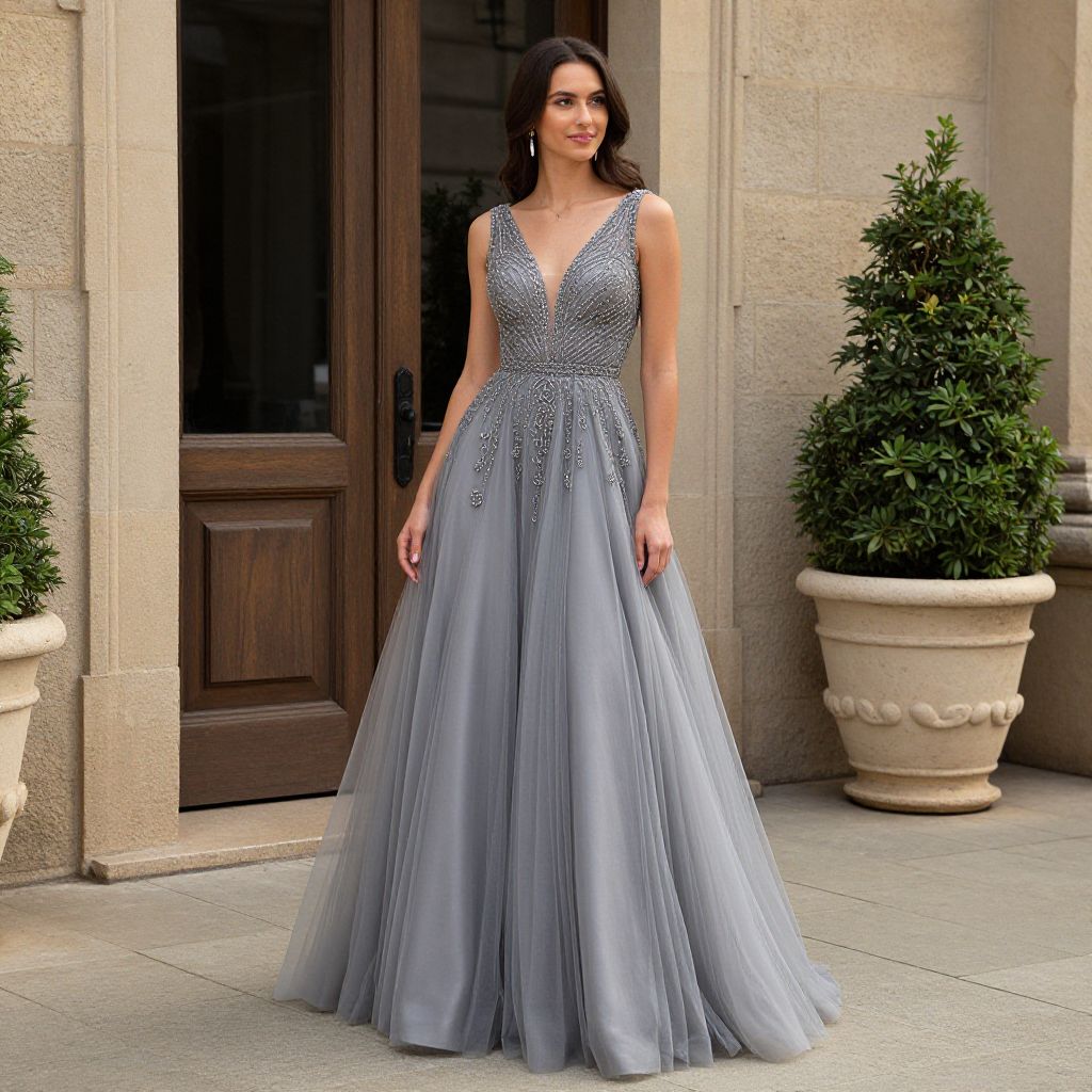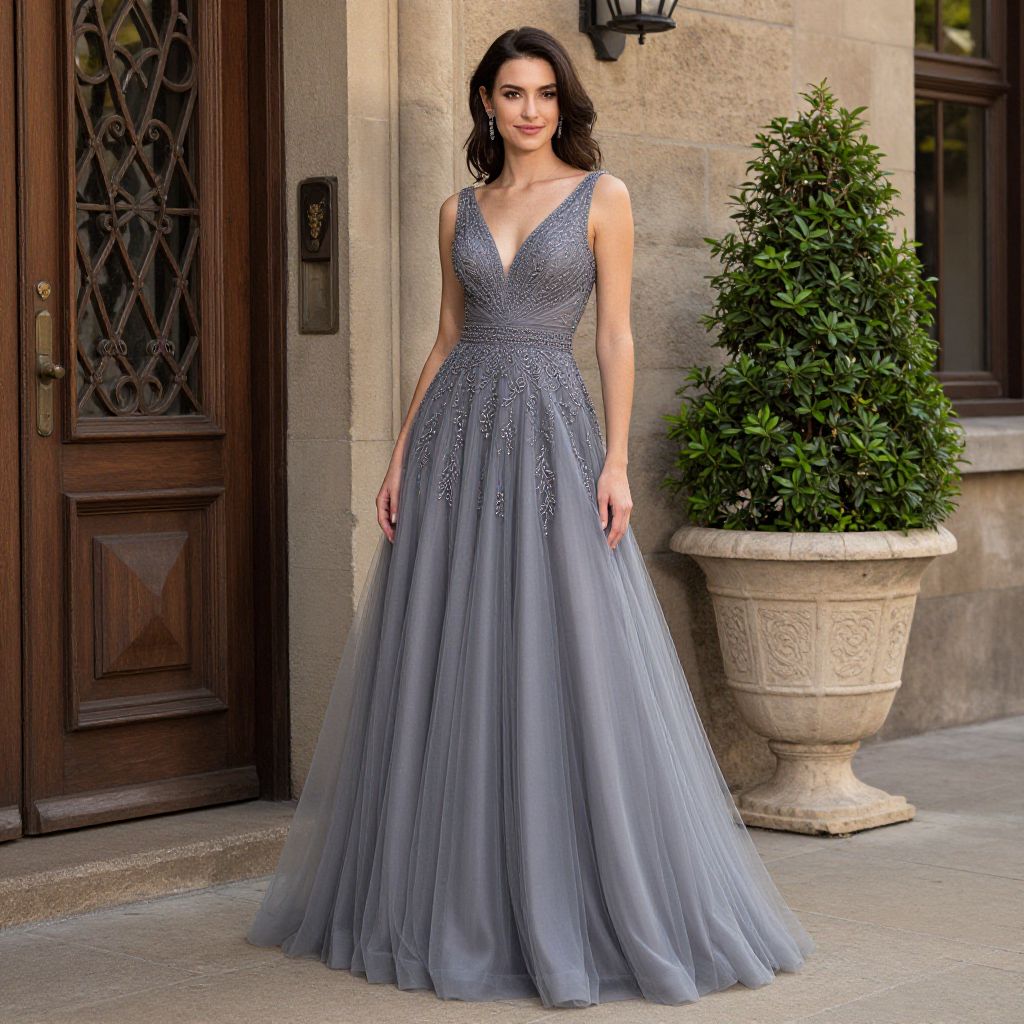 Elegant woman wearing a gray tulle A-line long prom dress with intricate beaded detailing, gracefully posing outdoors in front of a stone building with a wooden door and potted greenery to her right.