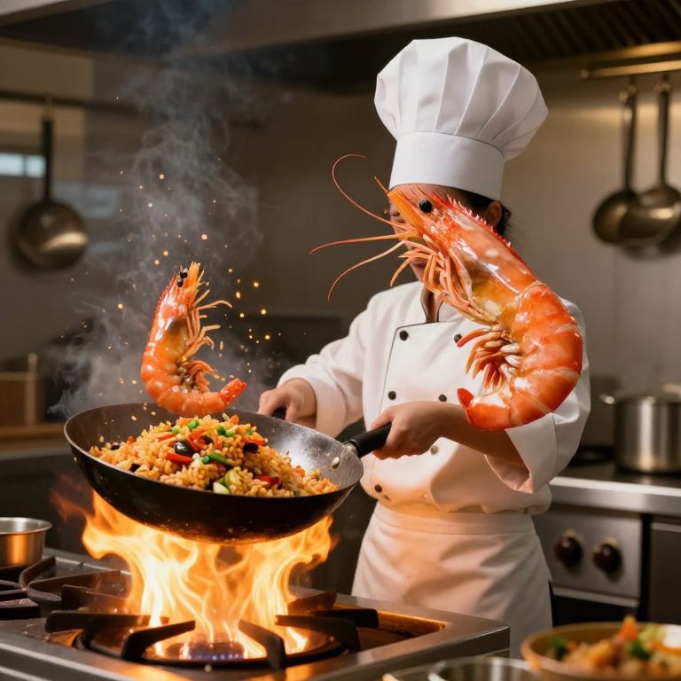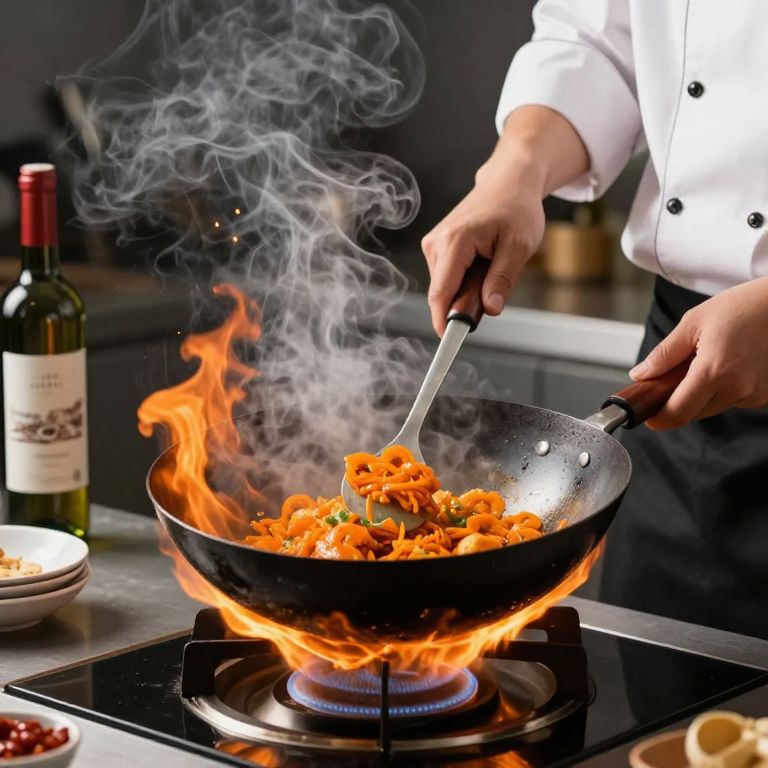 Chef skillfully stirs a vibrant orange dish in a flaming wok, surrounded by billowing smoke and a backdrop of kitchen essentials, including a bottle of wine and neatly stacked bowls.
