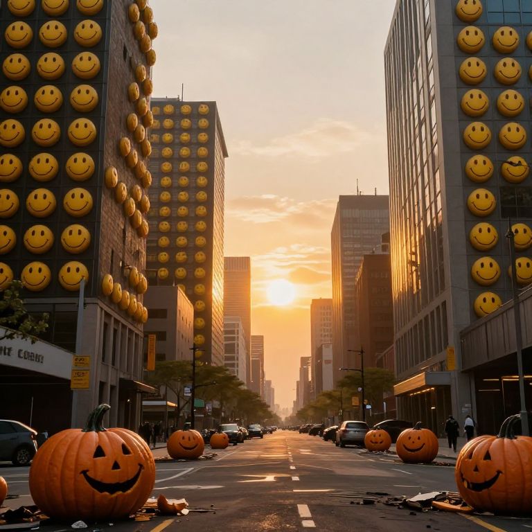 Sunset bathes a dystopian urban landscape in golden light, where towering buildings adorned with rows of cheerful smiley faces stand ominously above streets littered with oversized pumpkins and debris, hinting at a surreal yet foreboding atmosphere.
