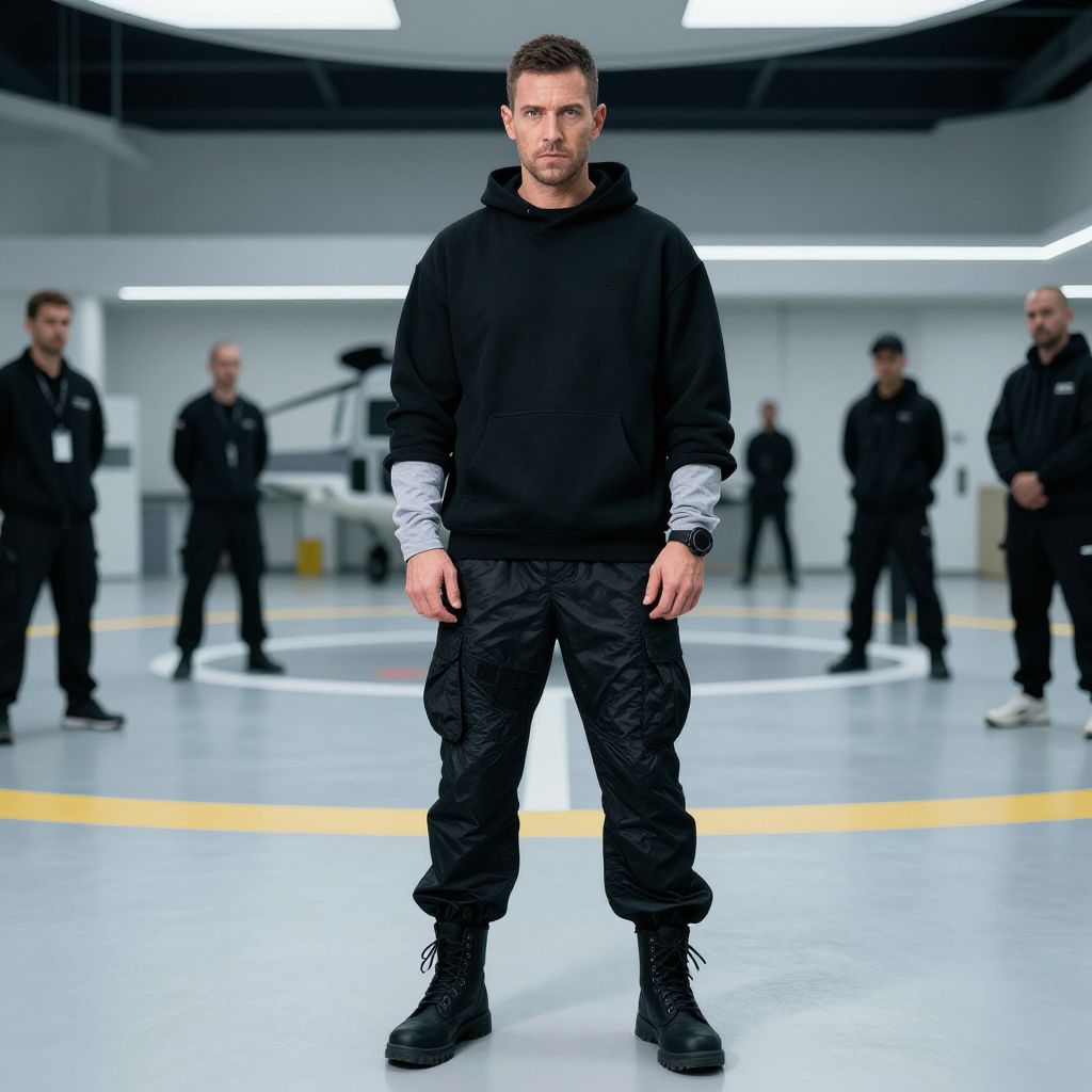 A man, layered long-sleeve base layer, oversized black tactical hoodie, durable nylon cargo pants, minimalist black combat shoes, modern facility with a helipad, lithographic film style, focused expression, coordinating with staff. Man has masculine face and piercing eyes