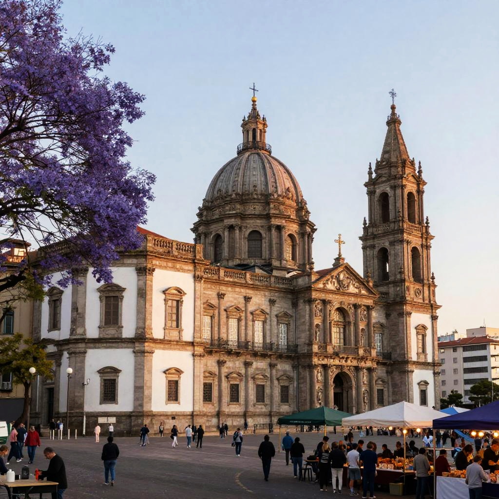 Valladolid's architectural contrast, focusing on the juxtaposition between its famous Renaissance palaces and modern urban elements, framed by blooming jacaranda trees and a lively market scene under soft morning light.