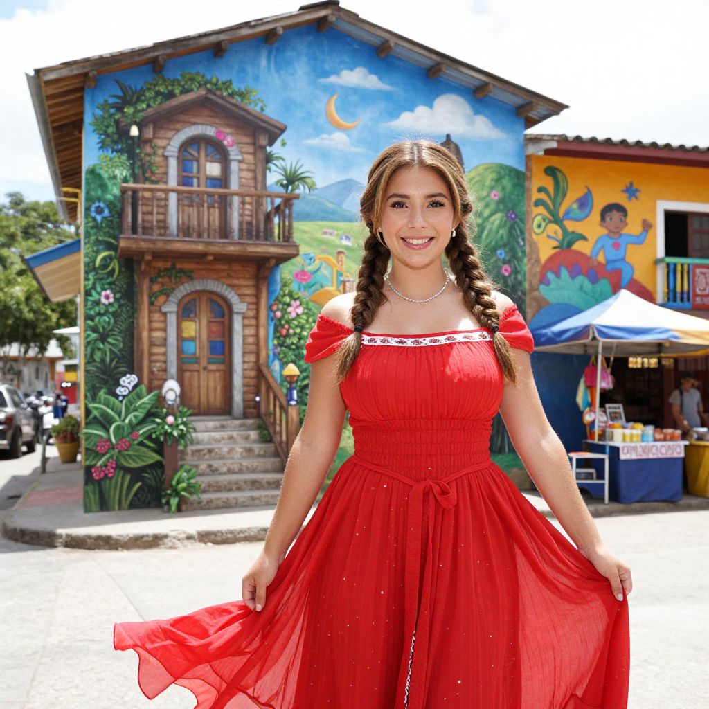 Photograph of a smiling young woman with fair skin and long brown hair in braids, wearing an off-shoulder, red, flowing dress with sparkles. She stands in front of a vibrant, colorful street scene featuring a painted blue house with a wooden balcony, potted plants, and a mural of a crescent moon. To the right, a yellow building with a mural of a child and a blue canopy over a stall. The street is bright and sunny, with shadows suggesting midday. The woman's dress is cinched at the waist, and she holds the skirt slightly outwards.