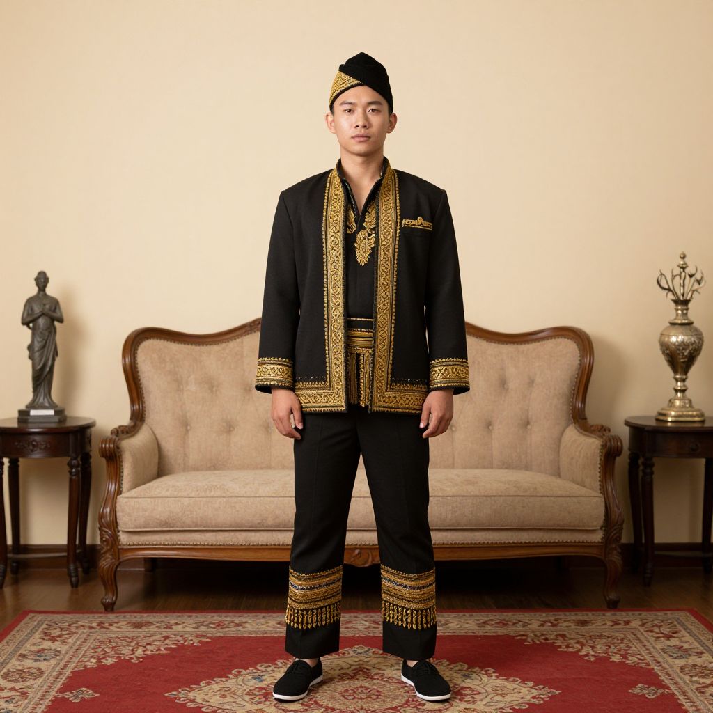 Photograph of a young Asian man in black traditional attire with gold embroidery, standing in front of a beige sofa, flanked by a statue and orn