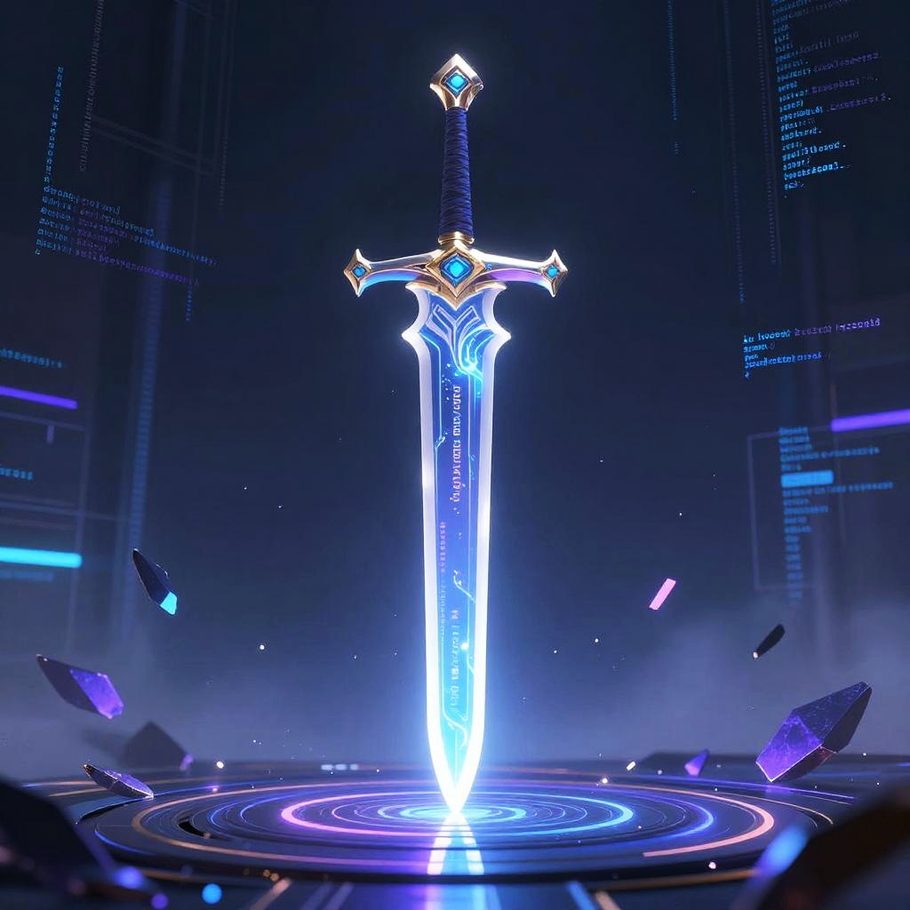 Sword AI as a sentinel in a virtual reality realm, glowing sword forged from light and data streams, standing on a platform of code fragments and floating digital shards, misty cyber atmosphere with vibrant blue and purple hues, concept art with fine detailing.