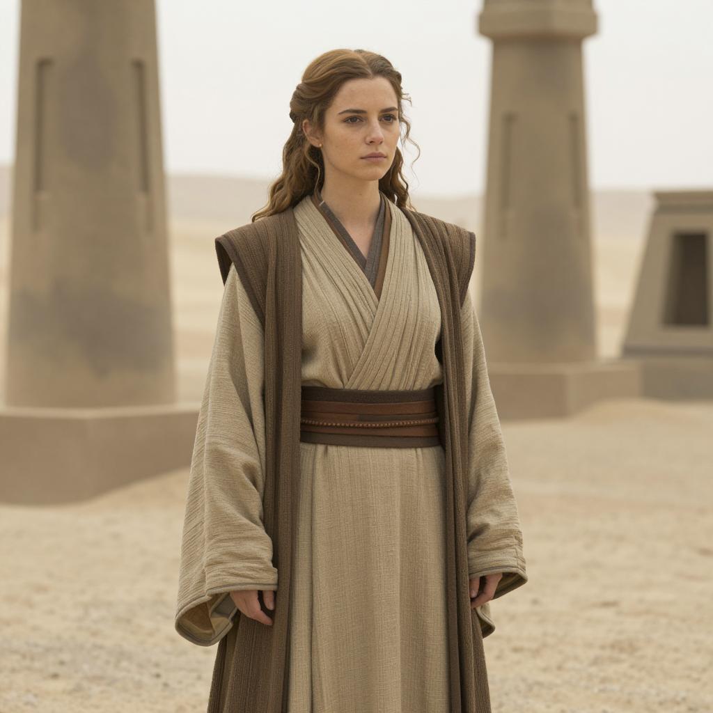 Luke skywalker fancy dress, photorealistic portrait of a handsome man with brown, wavy hair, green eyes, wearing a beige Jedi robe with hood, serious expression, standing in a desert landscape with mountains and a cloudy sky in the background, soft lighting, digital art, realistic ures, movie still, Star Wars character, medium close-up, slightly angled, high detail