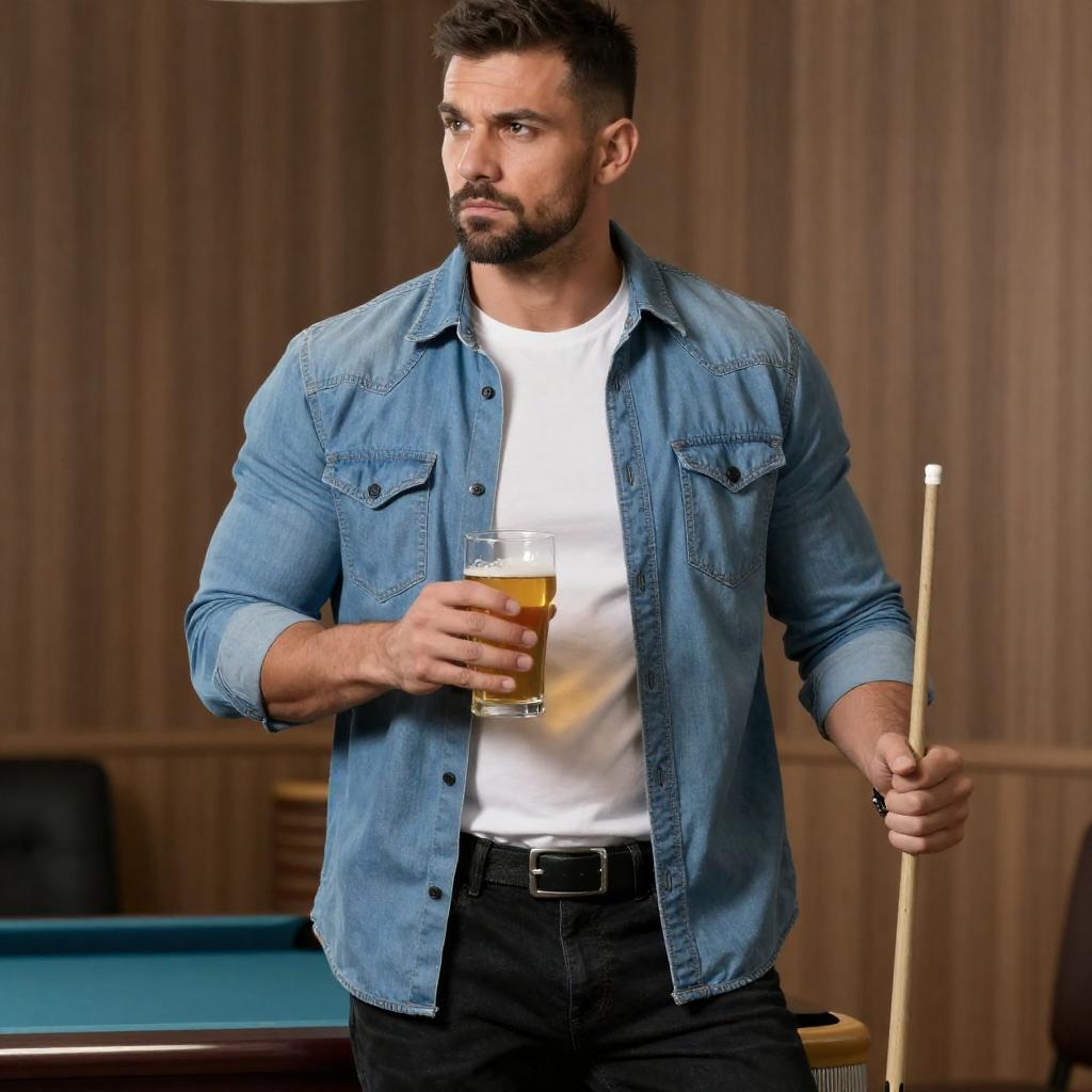 Photograph of a muscular man with short dark hair and a trimmed beard, wearing a light blue denim shirt over a white t-shirt, black jeans, and a black belt with a silver buckle. He holds a glass of beer in his right hand and a wooden cue stick in his left. He stands in a wooden room, looking to the side with a serious expression.