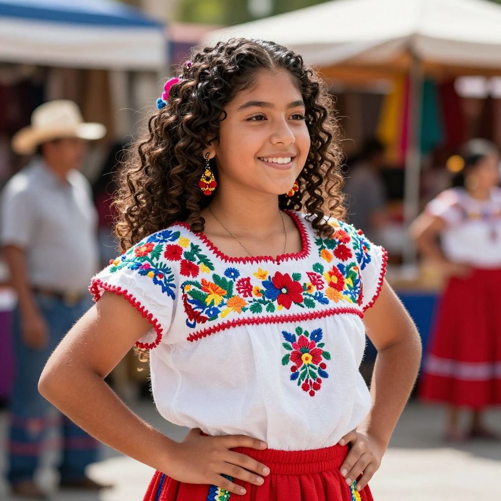 Mexican girl curly hair, vibrant traditional dress, sunny outdoor market setting, rich textures and warm colors, detailed intricate embroidery, joyful expression