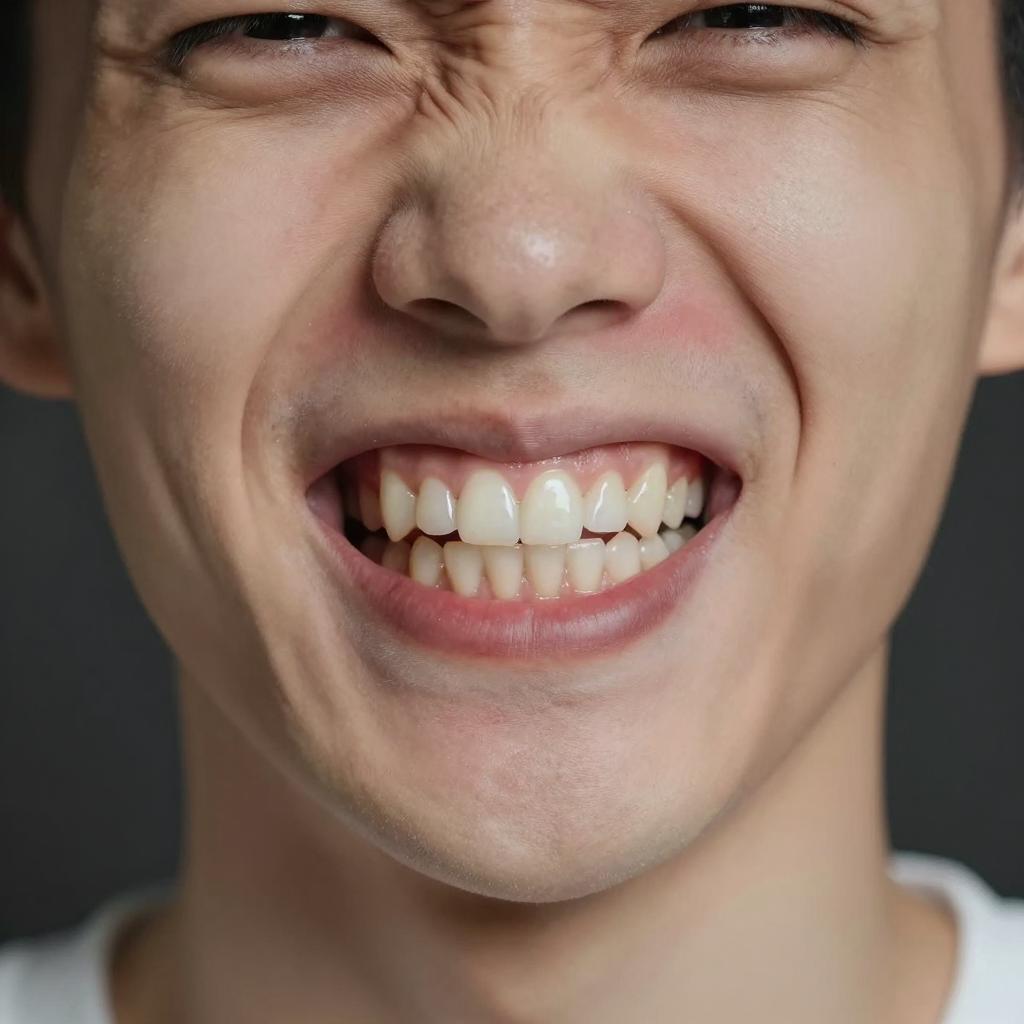 Close-up photograph of a person's face showing teeth clenched in a grimace. Fair skin, slight shadow on left side. Dark background. Slight redness on cheeks, glossy teeth. Mouth partially open, upper lip slightly raised. One visible ear on the right.