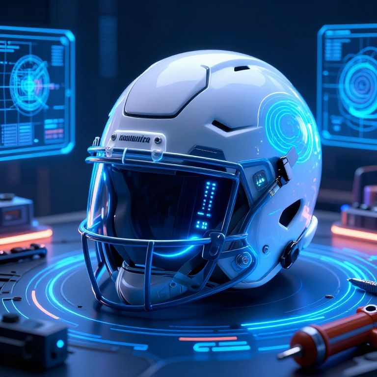 Futuristic football helmet builder creating a smart helmet with integrated tech sensors and LED displays, surrounded by holographic blueprints and high-tech tools, cyberpunk style with neon glows, ultra-detailed design and realistic shadows