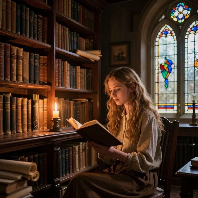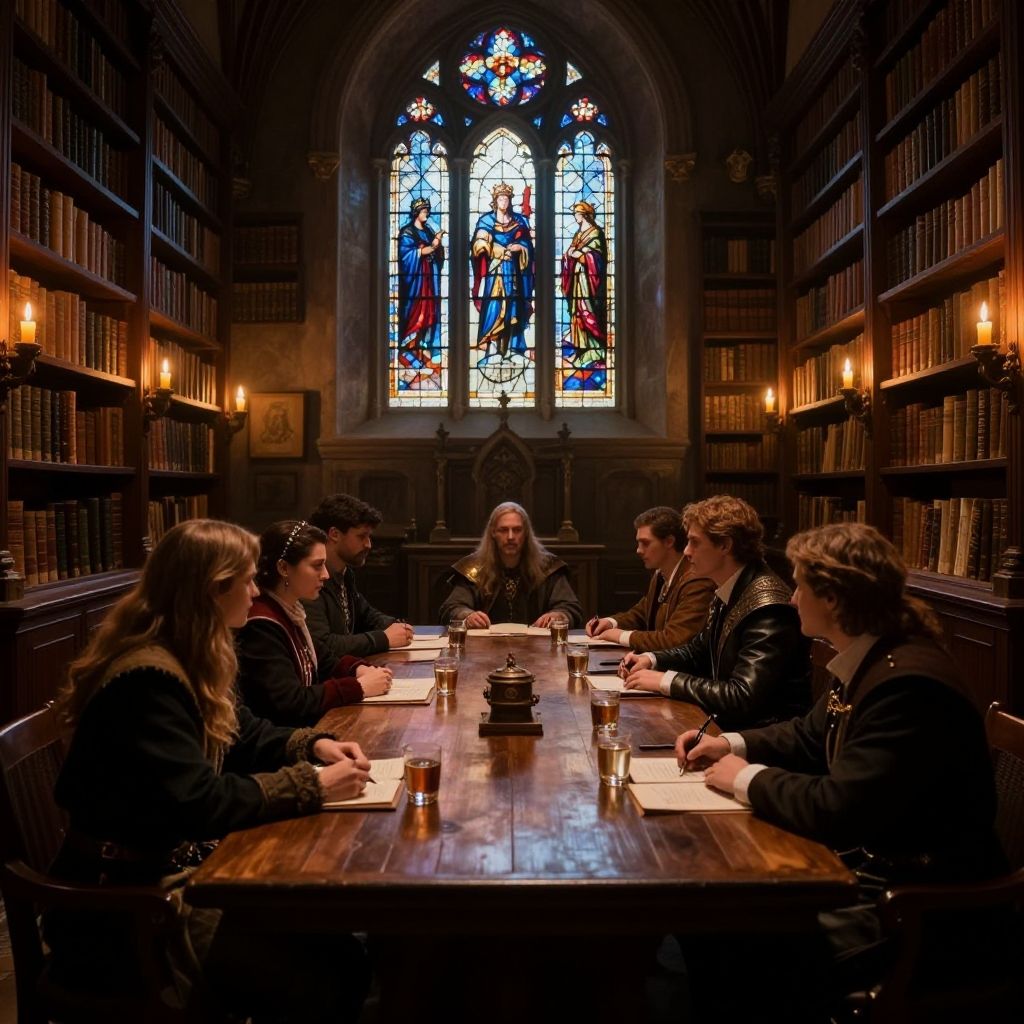 Photograph of seven people, five women and two men, seated around a long wooden table in a dimly lit, Gothic-style library. They are dressed in dark, formal attire, with leather jackets and collared shirts. The background features tall, wooden bookshelves filled with books, and a large, ornate stained glass window with religious imagery. The window's vibrant colors contrast with the dark wood and warm candlelight. The group appears focused, with notebooks and glasses on the table. The atmosphere is serious and scholarly, with a sense of historical grandeur.