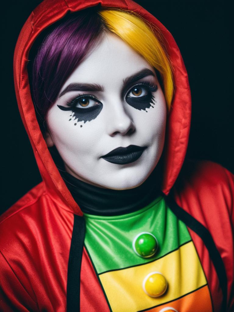 Person in Skittles Costume, photorealistic colorful cosplay portrait, cinematic realism