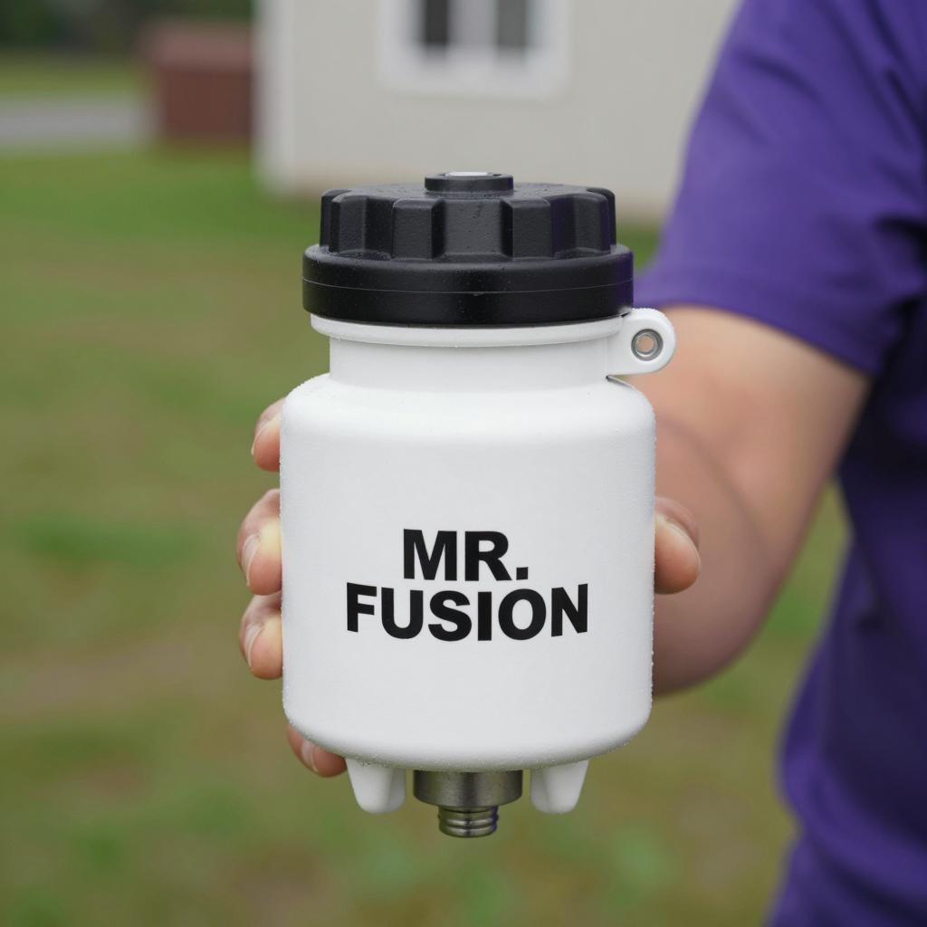 A white MR. FUSION fuel injector with a black and "MR. FUSION" and "GIVE ENOUGH REACTOR." Background includes green grass, a house, and a person with a purple shirt. Person's head is partially visible on the right.
