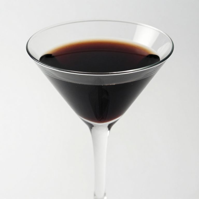Photograph of a clear martini glass filled with a dark liquid, likely a martini. The glass has a narrow, tall stem and a wide, shallow bowl with a slightly flared rim. The liquid is mostly opaque black, reflecting light and creating a glossy surface. The background is plain white, making the glass and liquid the main focus. The image is sharply focused with high contrast.