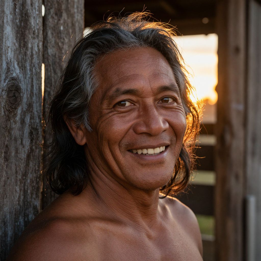 Craft a photorealistic portrait of a Pacific Islander man with a rugged yet soulful visage, his deep laugh lines and piercing eyes telling tales of a life lived. The setting sun's golden rays seep through wooden cracks, illuminating the rustic barn backdrop and adding warmth to his graying hair, slightly tousled. This intimate view captures the textured grain of aged wood, blending realism with artistic expression reminiscent of impressionist paintings.