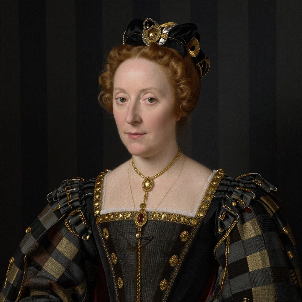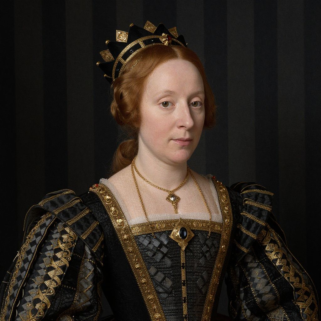 Portrait of Anne Boleyn by Hans Holbein the Younger depicts a woman with reddish-blonde hair adorned with a black and gold headpiece, wearing a black dress with intricate gold embellishments and a checkered overgarment, set against a dark striped background.