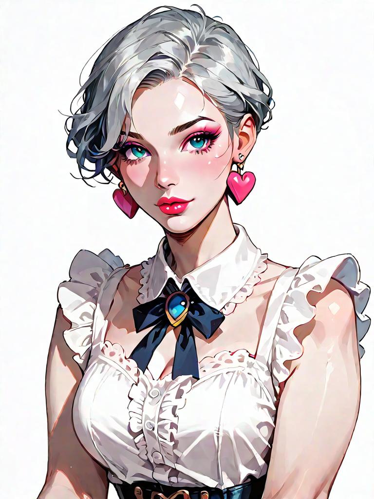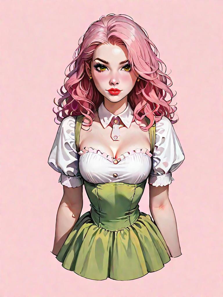 1girl, source_comics, realistic face, full body shot, Woman, modern preppy, white structured mini dress, Peter Pan collar, short puff sleeves, fitted waist, flared skirt, soft makeup, wavy hair down, plain light pink background.