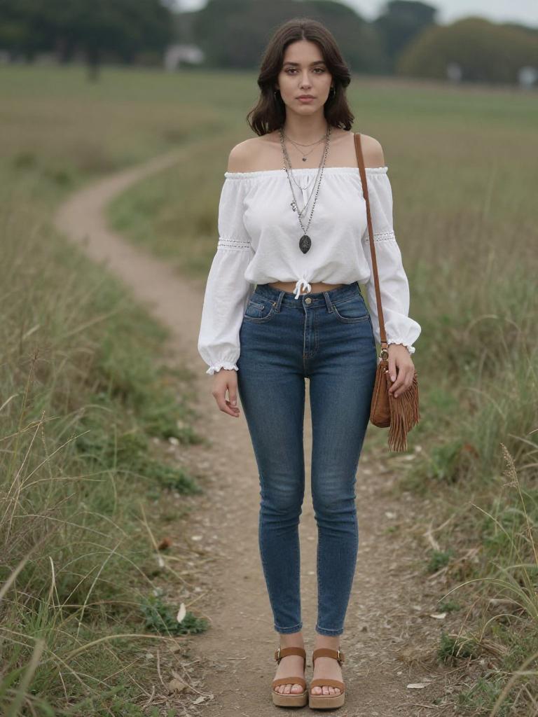 A slim woman in a bohemian white off-the-shoulder blouse and blue skinny jeans stands in a meadow with a winding path, wearing brown platform sandals and carrying a brown fringed shoulder bag, adorned with multiple layered necklaces. Visual style: cri film. Sexy. Pretty face and beаutiful eyes. Big breasts