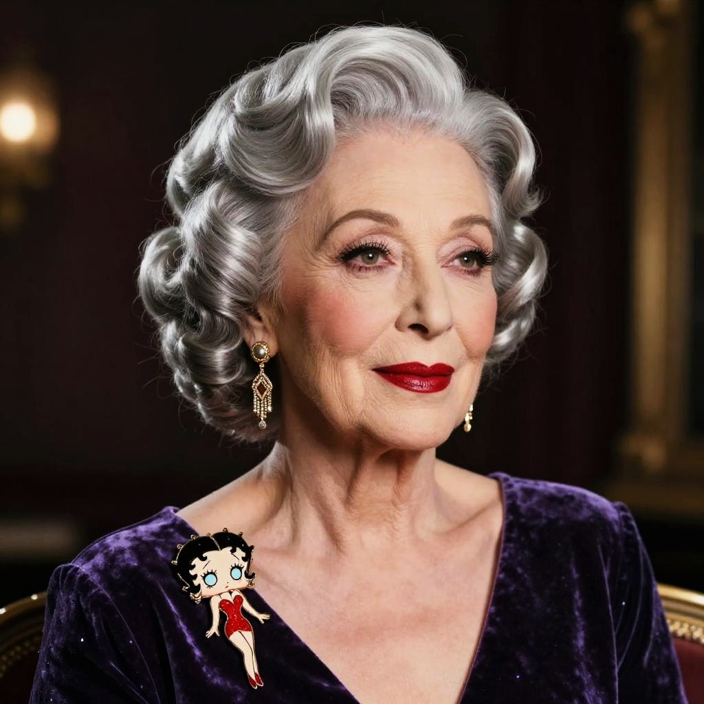 Ultra-realistic portrait of an elegant elderly jazz chanteuse with sculpted silver finger waves, velvet gown, and an art-deco brooch styled as Betty Boop, shot on a DSLR, cinematic lighting, high detail, soft skin texture, glossy red lips, 1920s vintage aesthetic, inspired by Helmut Newton, high-fashion cinematic editorial.