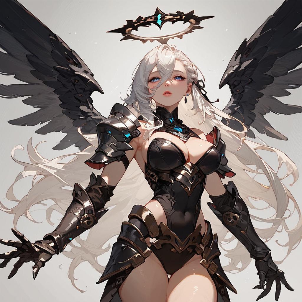 Score_9, score_8_up, score_7_up, score_6_up, solo, looking at viewer, white hair, white theme, long hair, armor, blue eyes, parted lips, hair between eyes, cowboy shot, gauntlets, wings, braid, halo