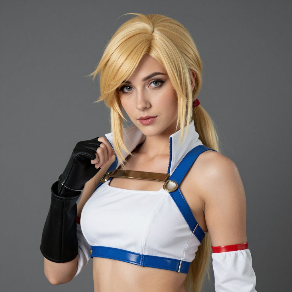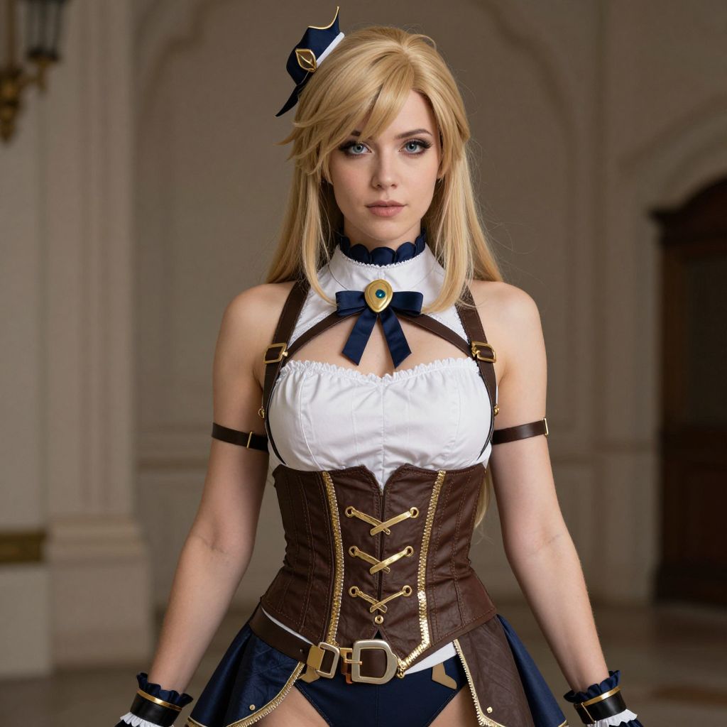 A young woman with fair white skin, glowing golden eyes, and soft blonde hair stands in a dimly lit haunted mansion, wearing a sleek white skin-tight dress that hugs her curves perfectly. The dress has a high neck and sheer back, glowing slightly under the candlelight. She holds a vintage mirror in her hands, the setting filled with fog and old wooden beams, creating a mysterious, eerie atmosphere.. The woman has big tits and cute face